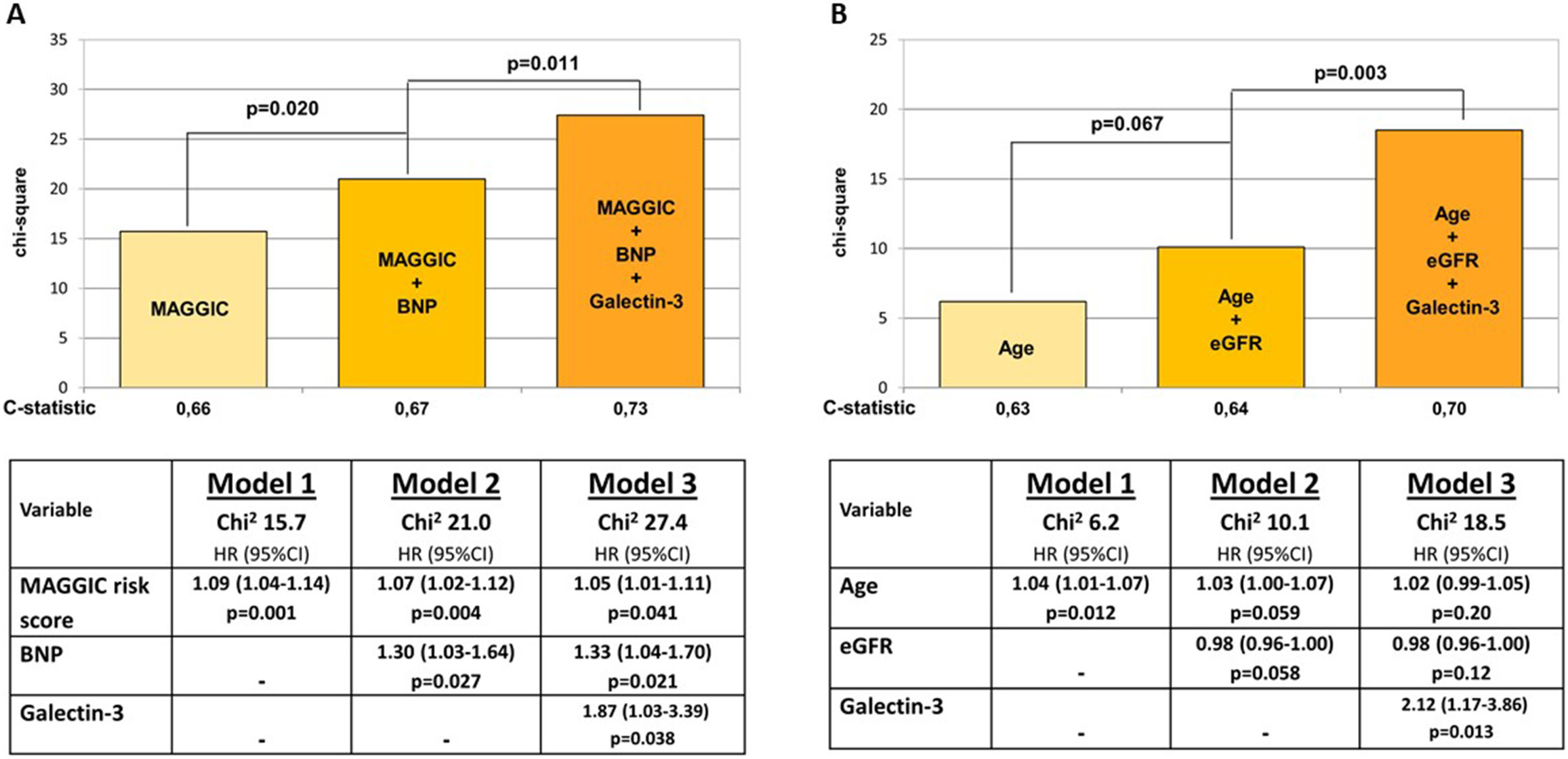 In the sequential Cox analysis presented in Figure 1A, the addition of Gal-3 to the model including MAGGIC risk score and BNP improved the predictive power for HF hospitalization or CV death. Analogically, the addition of Gal-3 to the model including patient age and eGFR provided an incremental predictive benefit for the composite study endpoint (Figure 1B).