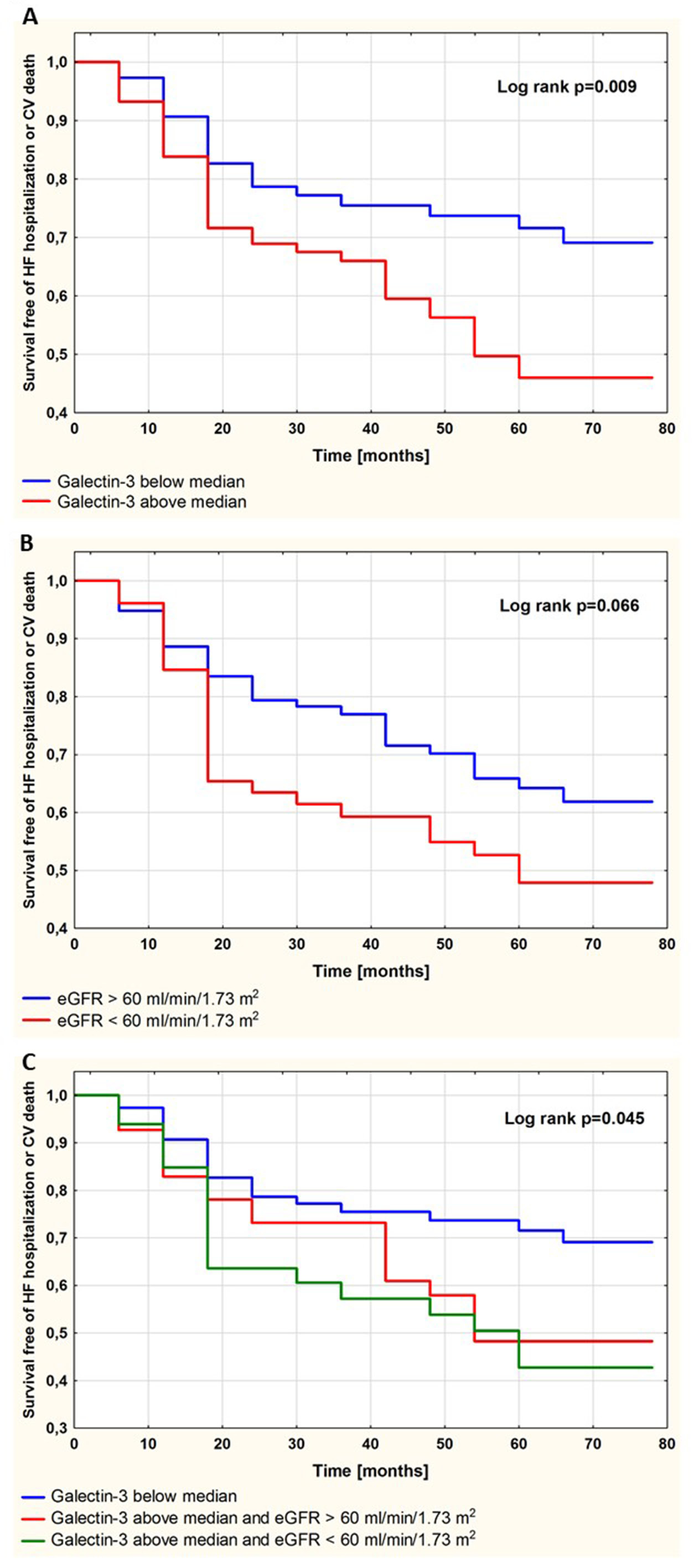 Survival free of the study endpoint is shown in Figure 2. Patients with Gal-3 concentration above the median (1.30 ng/mL) were at higher risk for HF hospitalization or CV death in comparison with patients with Gal-3 concentration below the median (p = 0.009; Figure 2A). There was a trend towards a higher incidence of the study endpoint in patients with eGFR 30–60 mL/min/1.73 m2 compared to patients with normal renal function (p = 0.066; Figure 2B). The increased risk for adverse outcome associated with higher (above the median) Gal-3 was not amplified by the coexistence of moderate renal impairment (eGFR 30–60 mL/min/1.73 m2; p = 0.60; Figure 2C).