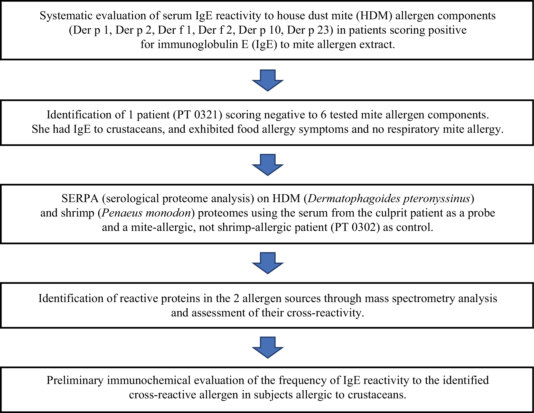 This study aimed to characterize using SERPA the allergen component(s) responsible for IgE reactivity to HDM in 1 patient sensitized to shrimp and mites whose IgE scored negative for commercially available Dermatophagoides allergen components. The frequency of this reactivity in a group of allergic patients was also evaluated as part of the preliminarily characterization of the clinical relevance of the allergen responsible for the observed cross-reactivity.