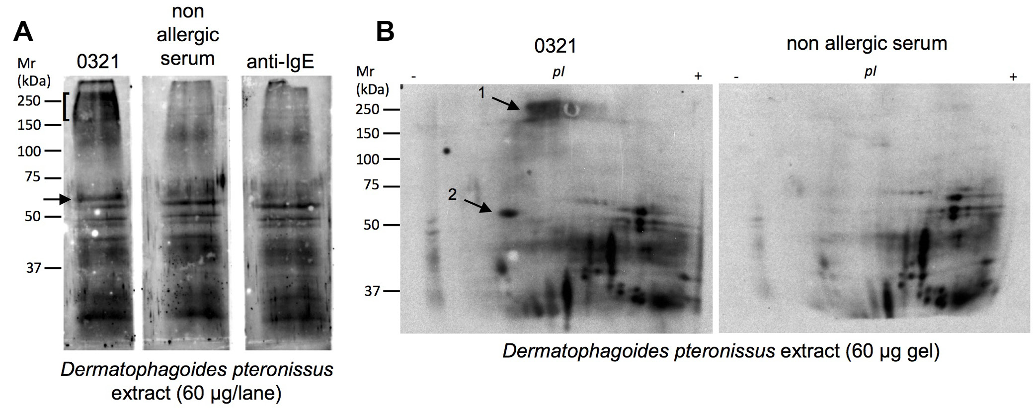 Evaluation of serum IgE reactivity to HDM components was performed in patients scoring positive for IgE to HDM extract, as part of the routine evaluation of patients reporting to our allergy clinic. Patient PT 0321 (a 49-year-old female) had a clinical history of food allergy (generalized urticaria and angioedema) reproducibly correlated with meals containing crustacean-based ingredients. Prick test and IgE to Dermatophagoides pteronyssinus scored positive, but she did not report any symptoms compatible with respiratory allergies and respiratory or contact reactions following overt exposure to house dust.