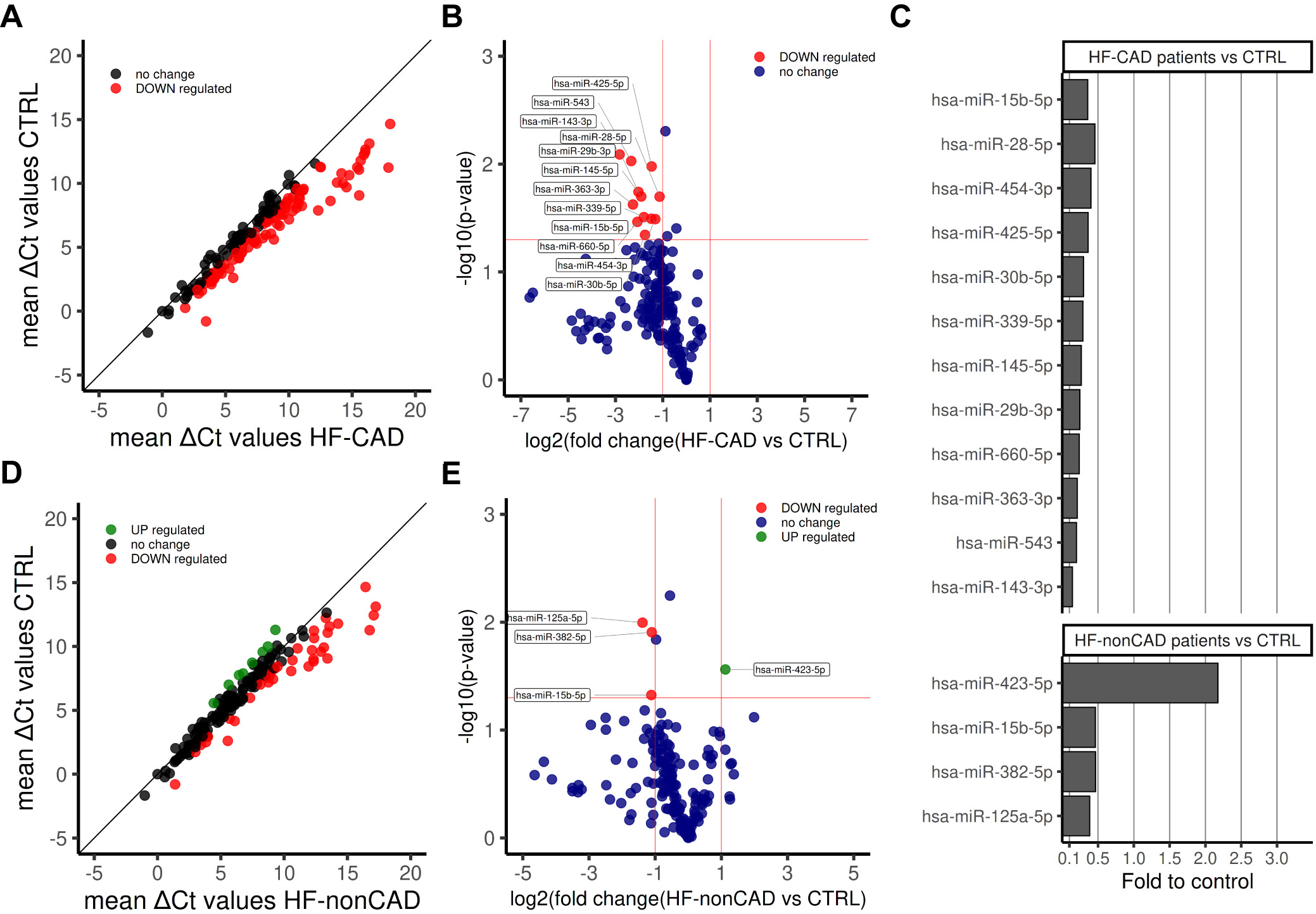 Materials and methods. The accumulation of 179 miRNAs was measured in serum of diabetic patients with HF and compared to the same measurements in healthy control subjects. The miRNAs were assayed using quantitative polymerase chain reaction (qPCR) on the Serum/Plasma Focus microRNA PCR panel (Qiagen) with LightCycler® 96 Real-Time PCR System (Roche). A pairwise comparison of mean relative miRNA accumulation levels was performed to establish those miRNAs that are differently expressed in patients with: 1) HF; 2) HF and chronic coronary syndrome (HF-CAD); and 3) HF without chronic coronary syndrome (HF-nonCAD) compared to healthy controls. To gain insight into these functions of miRNAs, we applied Gene Ontology (GO) enrichment analysis of Biological Processes and Molecular Functions of their predicted targets.
