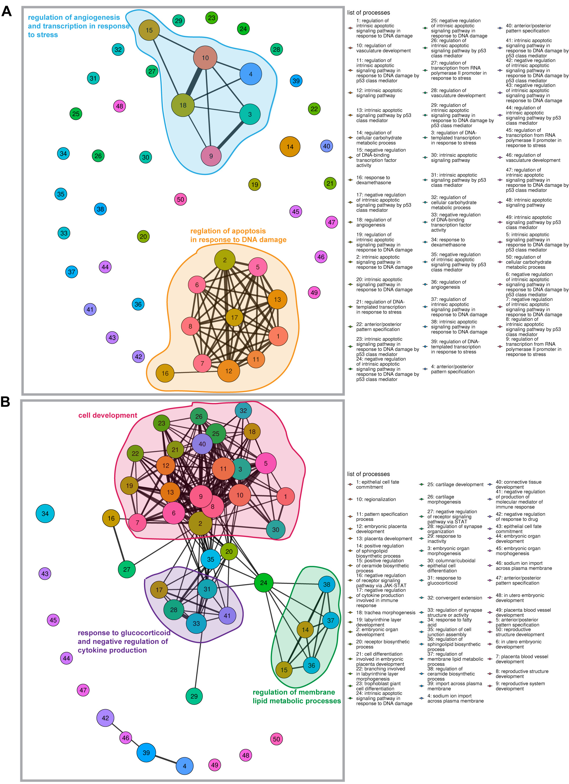 The GO analysis revealed that differentially accumulated targets of miRNAs include genes involved in potassium channel function, MAPK kinase activity and DNA transcription regulation, with similar alterations observed in the whole group and HF-CAD subgroup (Supplementary Fig. 3A) as well as genes involved in response to stress and apoptosis (HF), and genes involved in the development (HF-CAD) (Supplementary Fig. 3B). No oriented specializations of deregulated miRNA targets were observed for the HF-nonCAD subgroup. Functional networks of pathways regulated by mRNA targets of significantly altered miRNAs are presented in Figure 2.