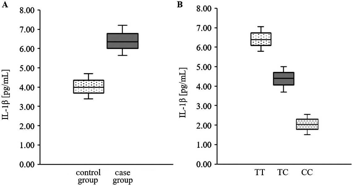 The IL-1β levels in the case group were higher than that of the control group (Student’s t-test, df = 854, t = 2.683, p = 0.008, Figure 1A). One-way ANOVA for IL-1β levels demonstrated a tendency for higher levels in TT compared to TC and CC genotypes (Figure 1B, 6.41 compared to 4.53 compared to 2.10 pg/mL, respectively; overall test: F = 10.537, p = 0.007, post hoc results are presented in Table 4).