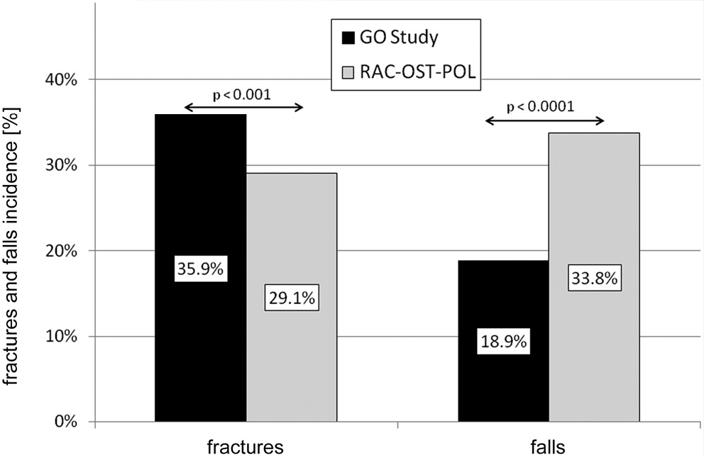 Falls were noted more often in subjects from the RAC-OST-POL cohort (n = 326, 33.8%) than in the GO Study (n = 273, 18.9%, p < 0.0001). The respective total numbers of falls were 526 and 490, and differed significantly (p < 0.0001). The incidences of fractures and falls in both study cohorts are presented in Figure 1.