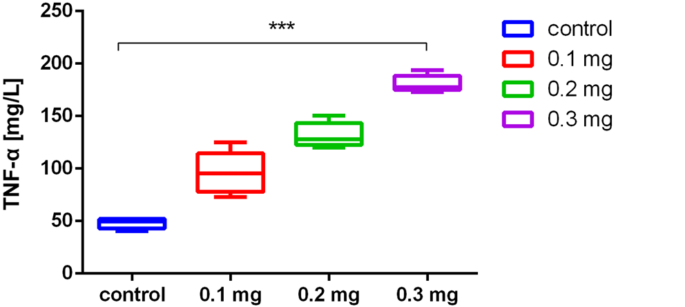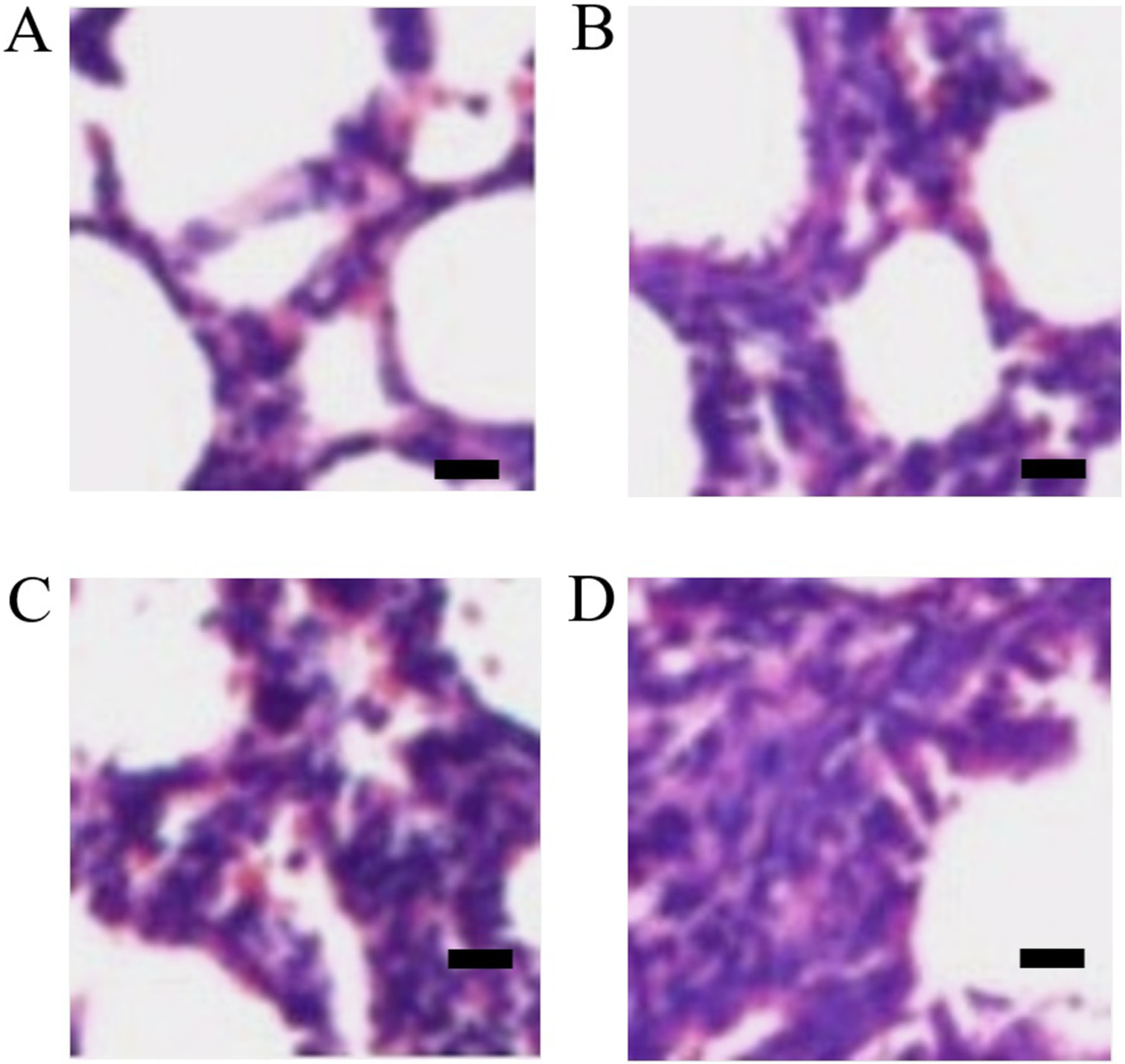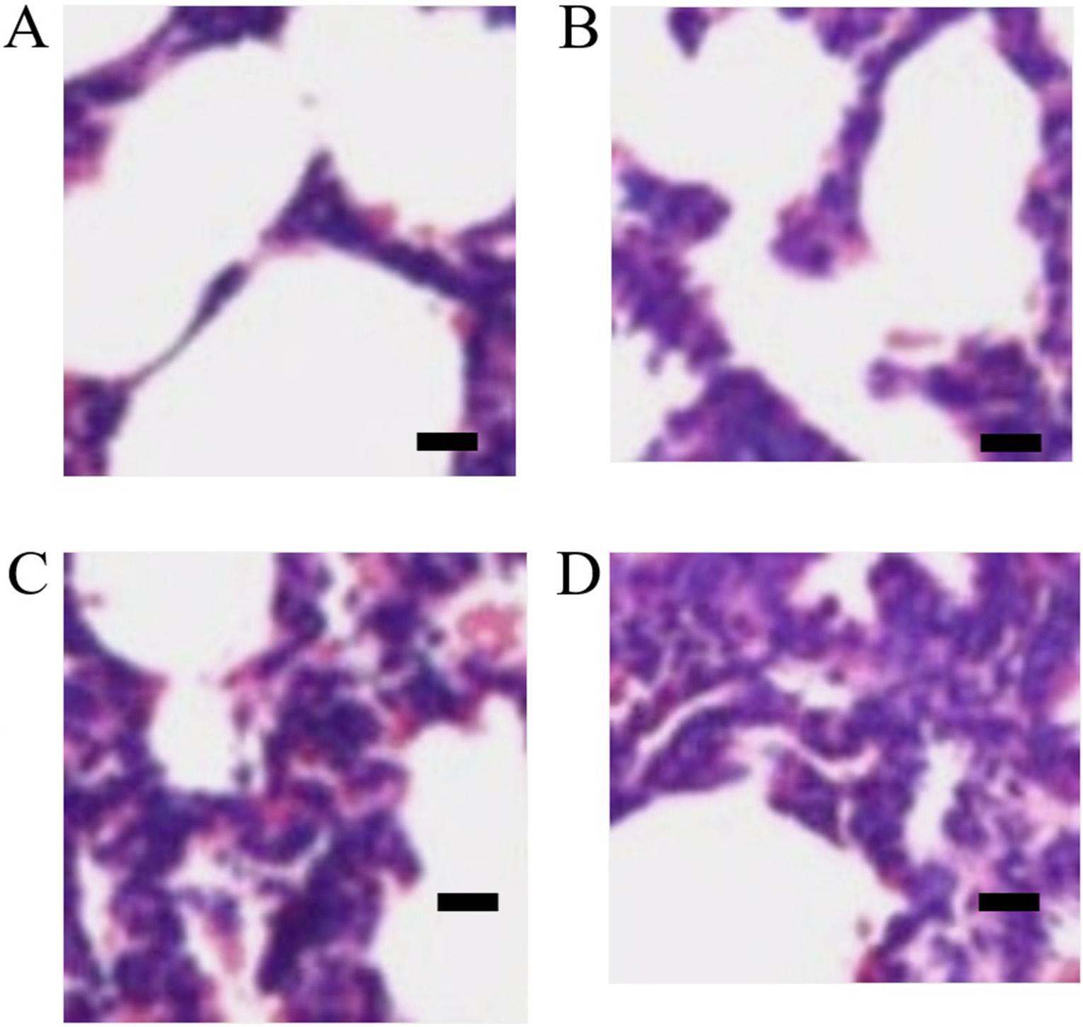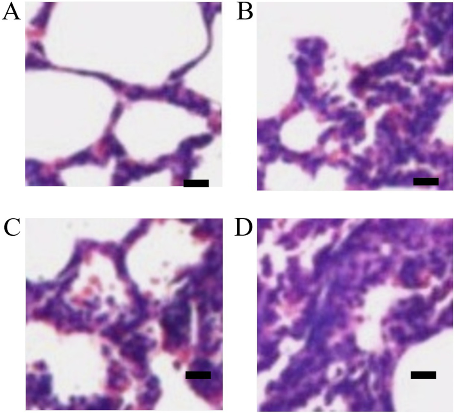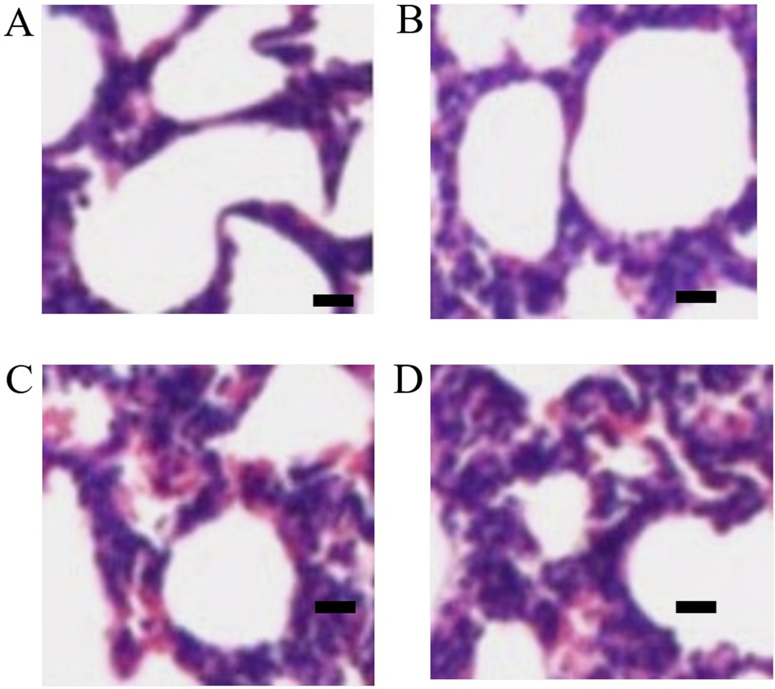 The pathological changes in the lung tissue were detected using hematoxylin and eosin (H&E) staining. Figure 7, Figure 8, Figure 9, Figure 10 show that lung injury induced by LPS was reduced in all experimental groups (the 0.1 mg group, the 0.2 mg group and the 0.3 mg group). As the infiltration of neutrophils increased, thickening of interstitial alveolar regions increased, and structural damage was reduced compared to the results of the control group.