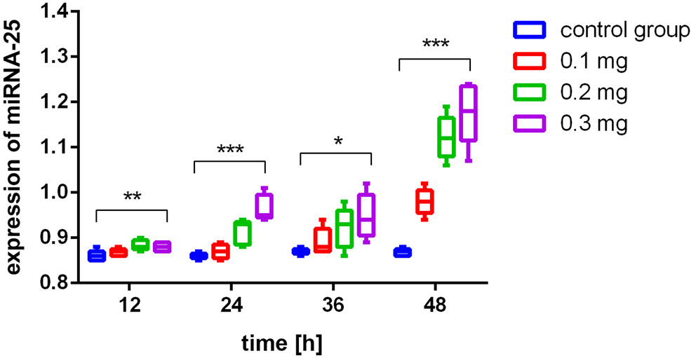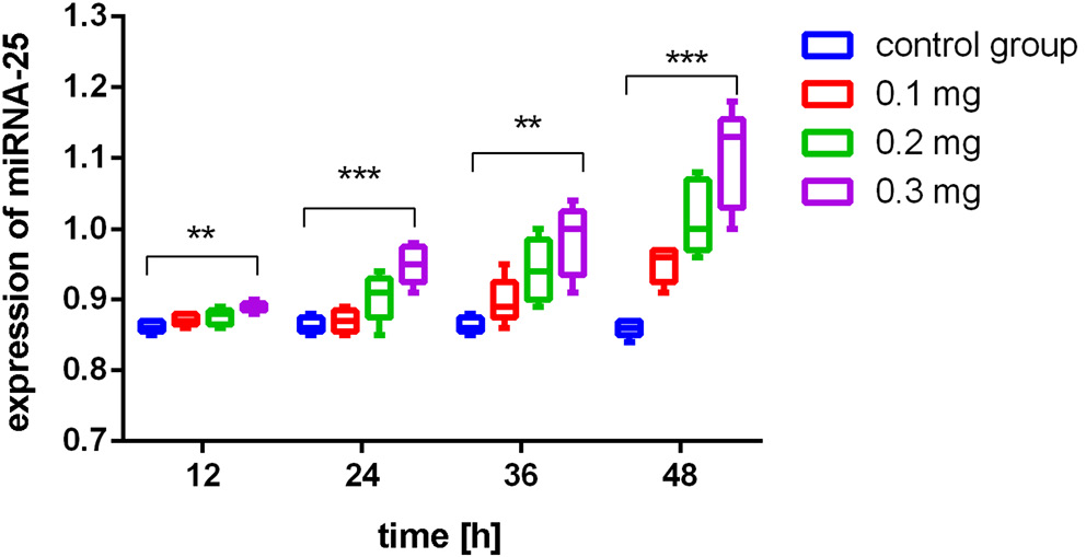The in vivo change in miRNA-25 expression was investigated after injecting the membrane-type PBLs into the rats. A control group was also established. We checked the lung tissues and BALF for the expression of miRNA-25 at different time points after the injection of PBLs,. Figure 1, Figure 2 present the results of miRNA-25 expression in lung tissue and BALF, respectively. It was found that in BALF, the expression of miRNA-25 was significantly enhanced after PBLs injection in experimental groups, suggesting that the expression of miRNA-25 tends to increase with an increasing amount of time after PBLs stimulation.