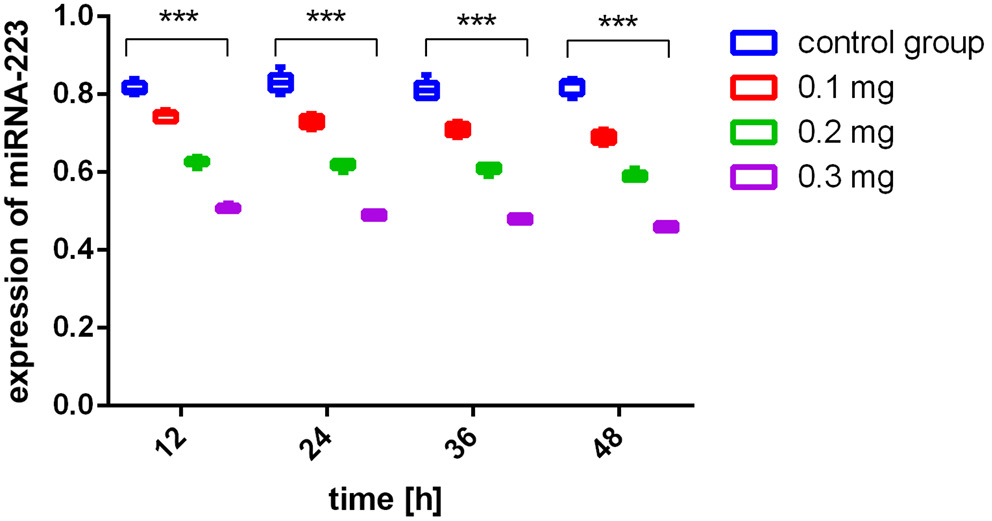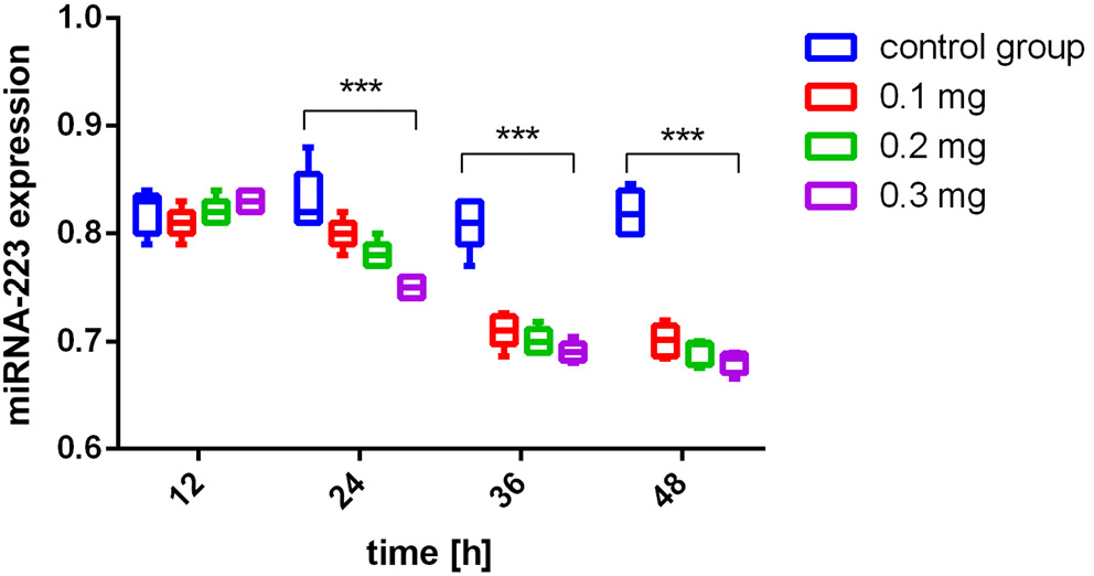The membrane-type PBLs were injected into BALF based on the established experimental approach. Figure 3, Figure 4 show the results of miRNA-223 expression in lung tissue and BALF, respectively. The miRNA-223 levels were found to be significantly reduced in the experimental groups. Compared to the control group, the expression of miRNA-223 was significantly reduced after prolonged periods following PBL injection.