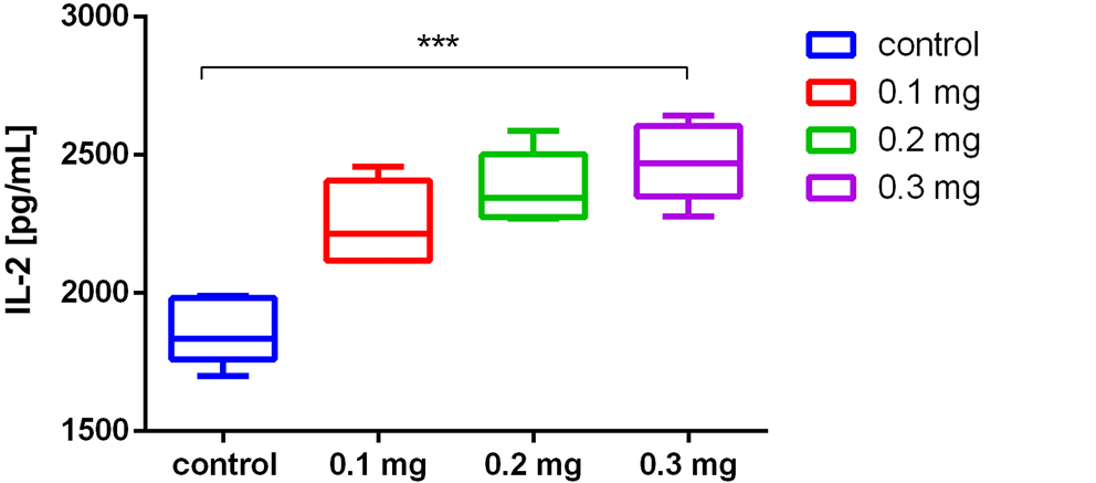 Figure 5 shows that the levels of TNF-α and IL-2 in BALF were enhanced after PBL injection. Peripheral blood leukocyte stimulation led to a dramatic increase in TNF-α levels. Furthermore, IL-2 levels dramatically rose a dose-dependent profile with statistically significant differences (p < 0.05). Similarly, Figure 6 shows that IL-2 protein levels in lung tissues were both increased. Therefore, it is clear that the administration of higher concentrations of PBLs resulted in higher TNF-α and IL-2 levels (p < 0.05).