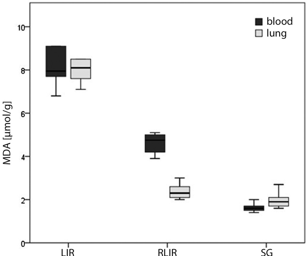 As shown in Table 1 and Figure 1, blood MDA levels in the LIR, RLIR and SG groups were 8.1 ±0.9 µmol/g protein, 4.6 ±0.5 µmol/g protein and 1.6 ±0.2 µmol/g protein, respectively. Lung MDA levels were 7.9 ±0.5 µmol/g protein, 2.4 ±0.4 µmol/g protein and 2.0 ±0.4 µmol/g protein, respectively. The total MDA levels in blood and lung in the RLIR and SG groups were significantly lower compared to the LIR group (p < 0.001, ANOVA, F = 180.5; p < 0.001, ANOVA, F = 339.3, respectively).