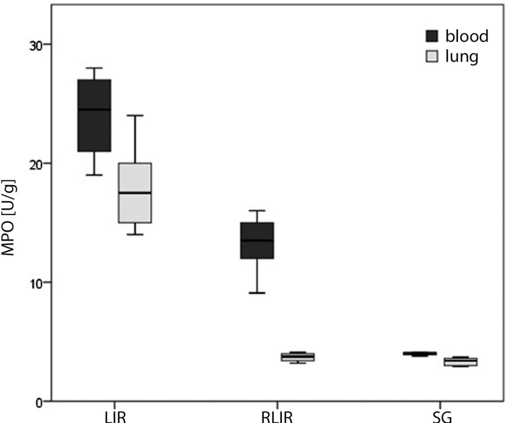 As shown in Table 1 and Figure 2, blood MPO levels in the LIR, RLIR and SG groups were 24.0 ±3.6 µmol/g protein, 13.2 ±2.5 µmol/g protein and 3.9 ±0.3 µmol/g protein, respectively. Lung MPO levels were 18.0 ±3.7 µmol/g protein, 3.7 ±0.4 µmol/g protein and 3.3 ±0.3 µmol/g protein, respectively. Significantly lower total MPO levels were observed in the RLIR and SG groups compared to the LIR group (p < 0.001, ANOVA, F = 96.7; p < 0.001, ANOVA, F = 88.5, respectively).
