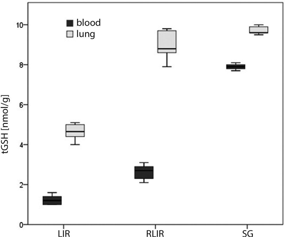 As shown in Table 1 and Figure 3, tGSH levels in the LIR, RLIR and SG groups were 1.2 ±0.2 nmol/g, 2.6 ±0.4 nmol/g and 8.1 ±0.4 nmol/g in the blood, and 4.6 ±0.4 nmol/g, 8.9 ±0.7 nmol/g and 9.5 ±0.5 nmol/g in the lung, respectively. The total tGSH levels in the RLIR and SG groups were significantly higher compared to the LIR group (p < 0.001, Kruskal–Wallis test, p < 0.001, ANOVA, F = 139.2, respectively).