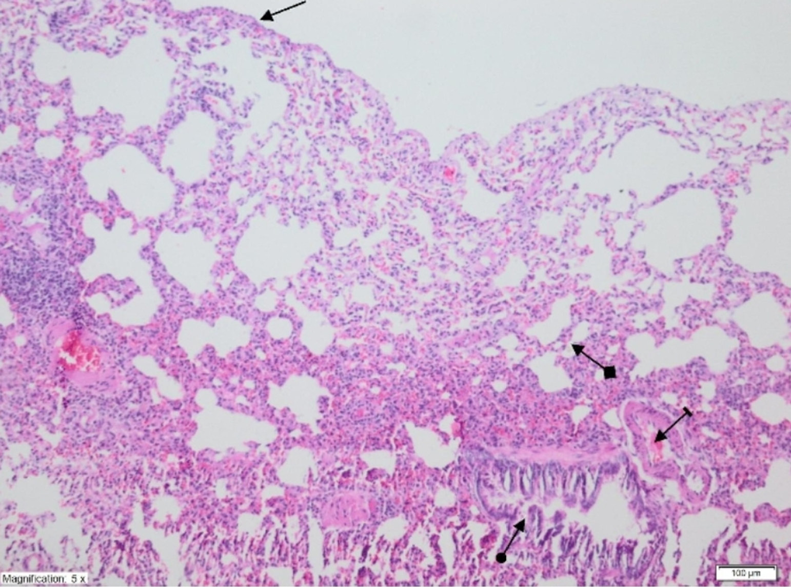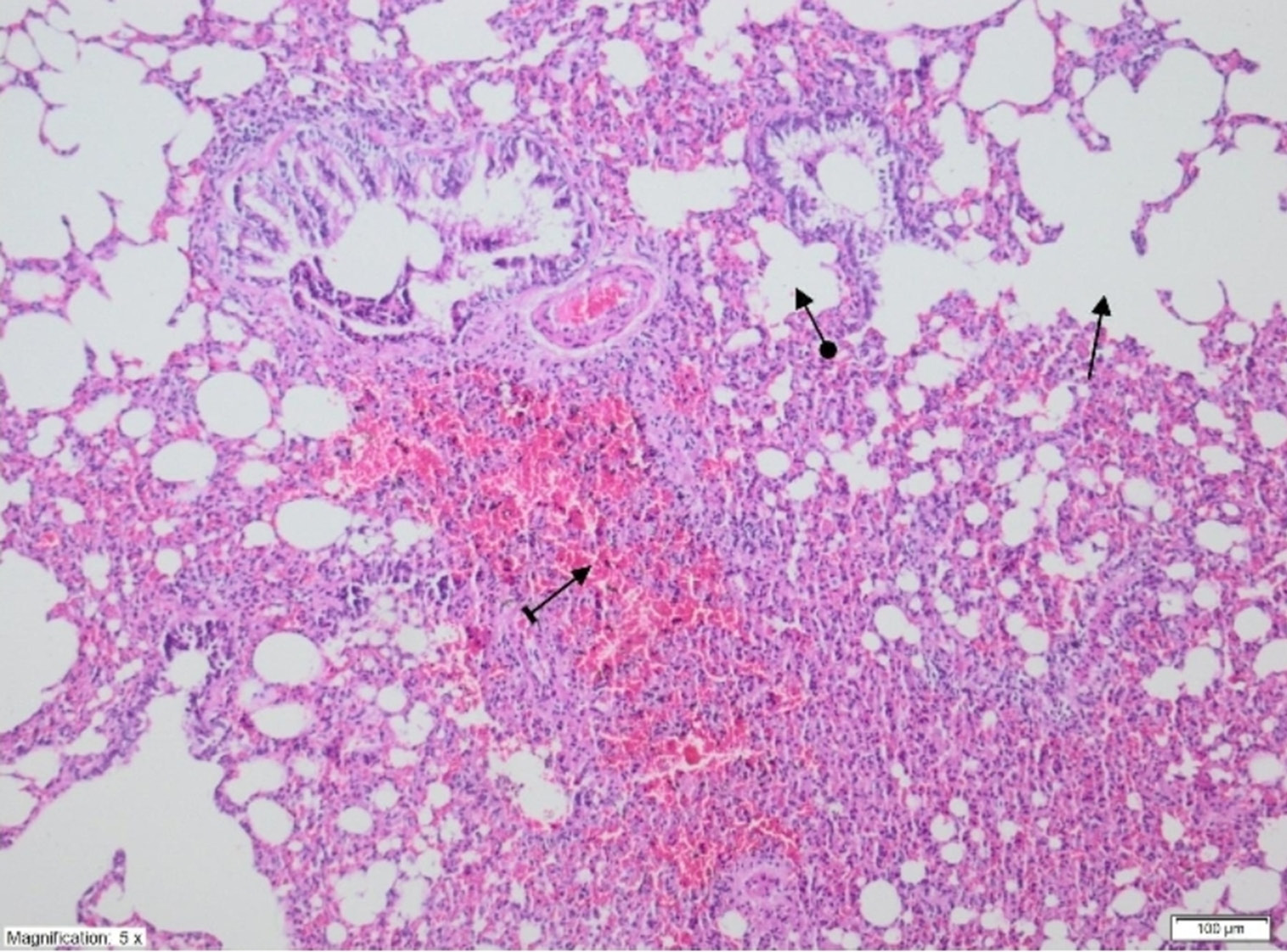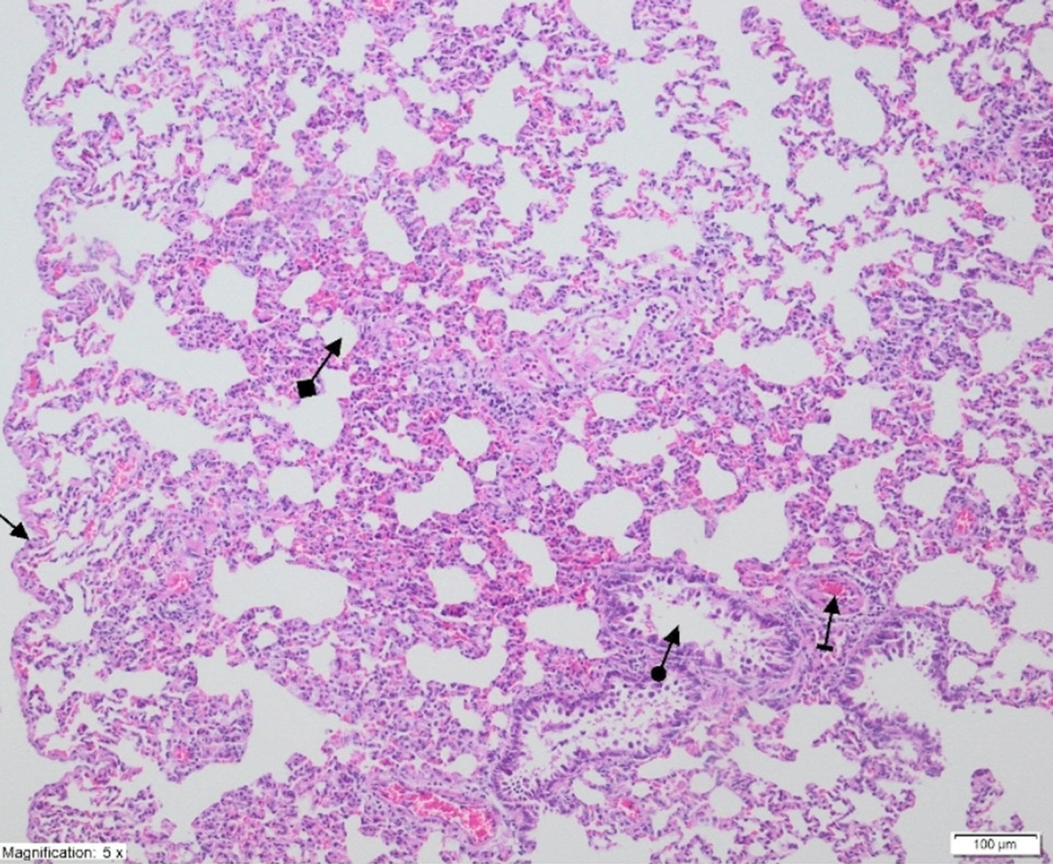 Ischemia/reperfusion injury to the lung can be observed on light microscopy examination of histopathological preparations stained with H&E.28, 29 The accumulation of neutrophils in capillary beds, interstitial edema, thickening of the alveolar septum, and the presence of protein-containing exudates in alveolar air cavities are common. Quantitative injury assessment is possible by examining 10 or 20 different sites under high magnification and counting the PMNLs in slides prepared in the same way.30