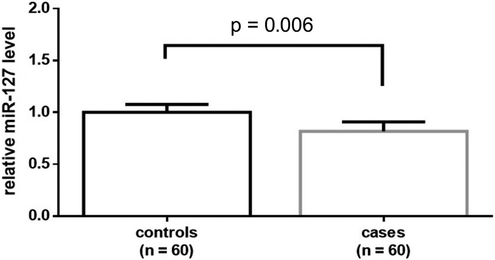 The age of BRC patients was not significantly different from that of controls (Student’s t-test, t = 0.252, degrees of freedom (df) = 118, p = 0.824) (Table 1). The percentages of BRC patients with positive estrogen receptor and progesterone receptor were 46.67% and 40.00%, respectively. The BRC patients at clinical stage IV accounted for 21.66% of cases. The relative miR-127 level was significantly decreased in the plasma of BRC patients compared to controls (Student’s t-test, t = 3.061, df = 118, p = 0.006) (Figure 1).