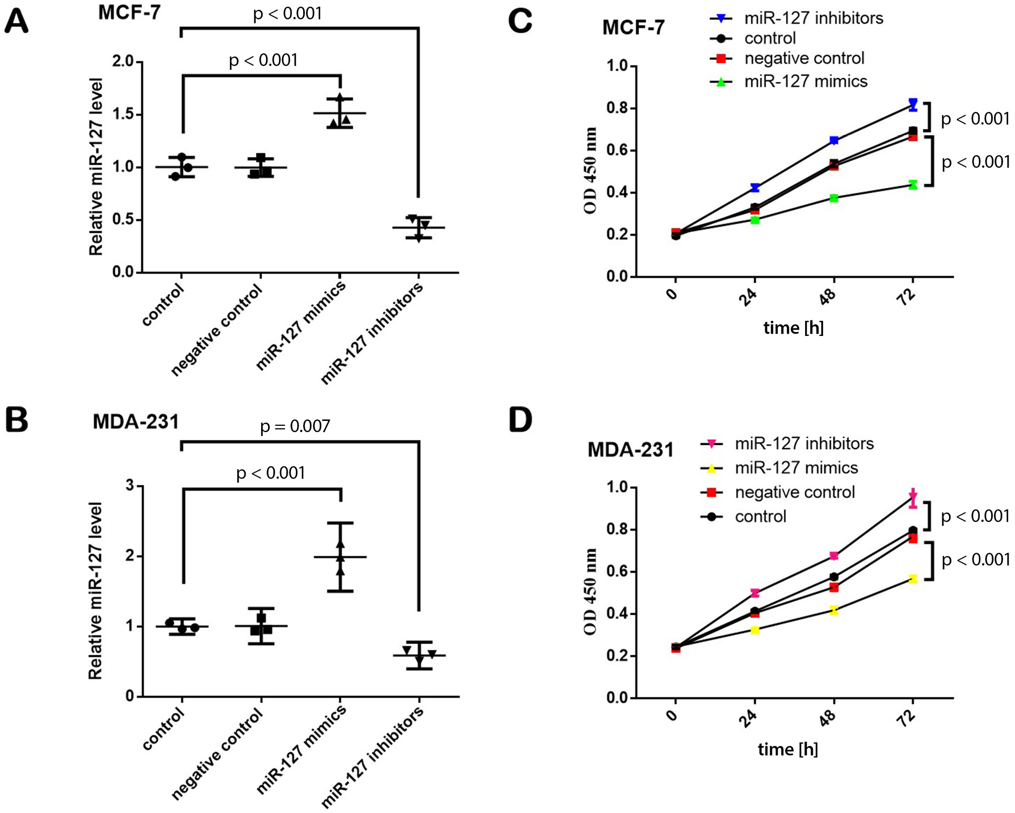 As demonstrated using the ANOVA test, there was a statistically significant effect of the treatments on the relative miR-127 level in both MCF-7 (F (3,8) = 55.436, p < 0.001) and MDA-231 cells (F (3,8) = 75.642, p < 0.001) (Figure 2A,B). When compared with controls, the relative miR-127 level in MCF-7 and MDA-231 cells was significantly upregulated after the cells were transfected with miR-127 mimics. However, the relative miR-127 level in MCF-7 and MDA-231 cells was downregulated after the cells were transfected with miR-127 inhibitors.