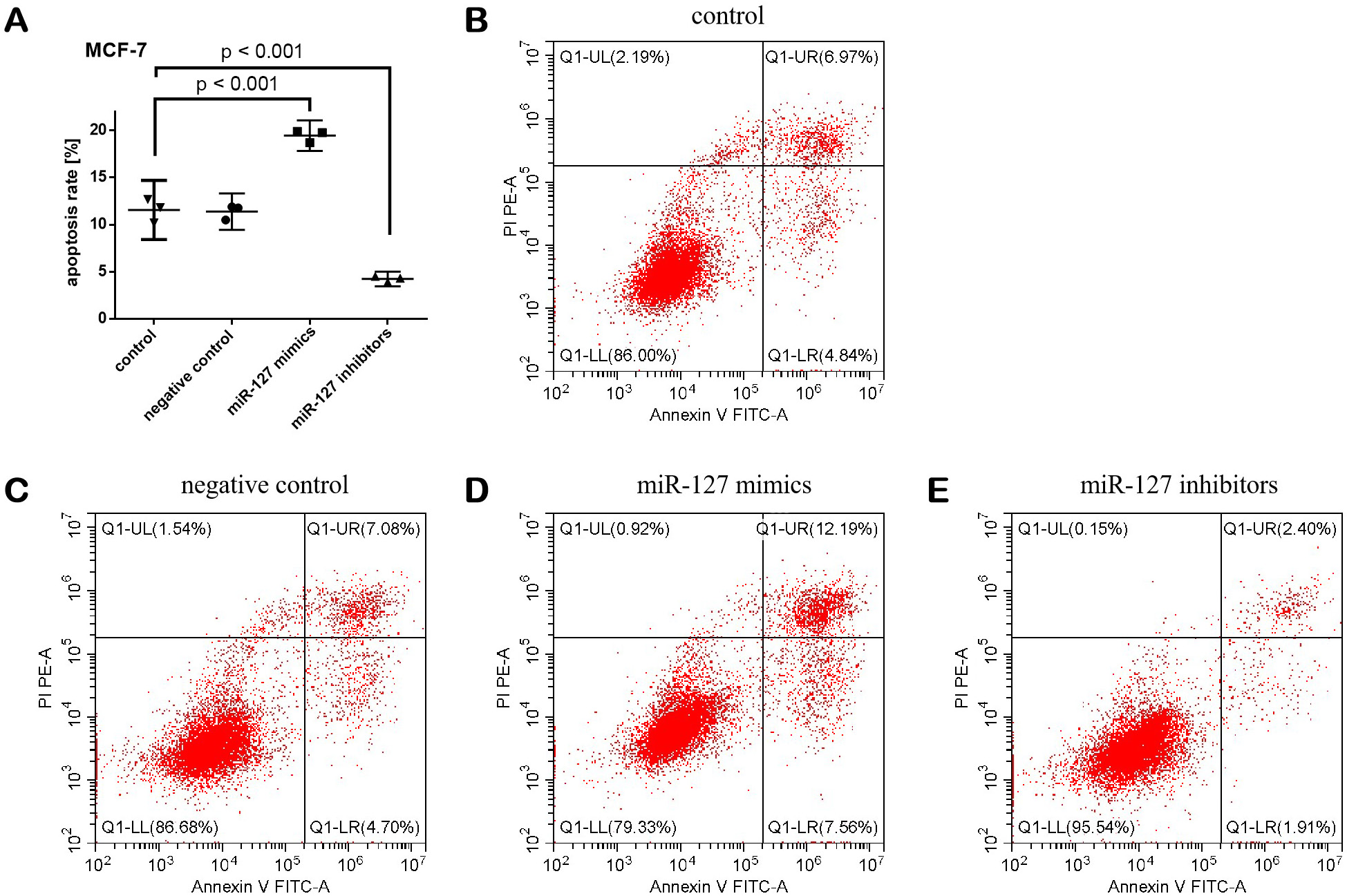 The apoptosis rates of MCF-7 and MDA-231 cells were measured with flow cytometry using Annexin-V-FITC/PI kit provided by Solarbio (Beijing, China). Cells transfected with miR-127 mimics, inhibitors and negative control were inoculated into a 96-well plate as above for 48 h, then collected and washed twice with cold 1× phosphate-buffered saline (PBS) and adjusted to 1×106 cells/mL using 1× binding buffer. Subsequently, 5 μL of Annexin-V-FITC and 5 μL of propidium iodide (PI) were successively added into 100 μL of cell suspension. Then, the mixture was incubated at 25°C for 15 min in the dark. Finally, flow cytometry was used to analyze the apoptosis rate of cells. Each experiment was performed in triplicate.