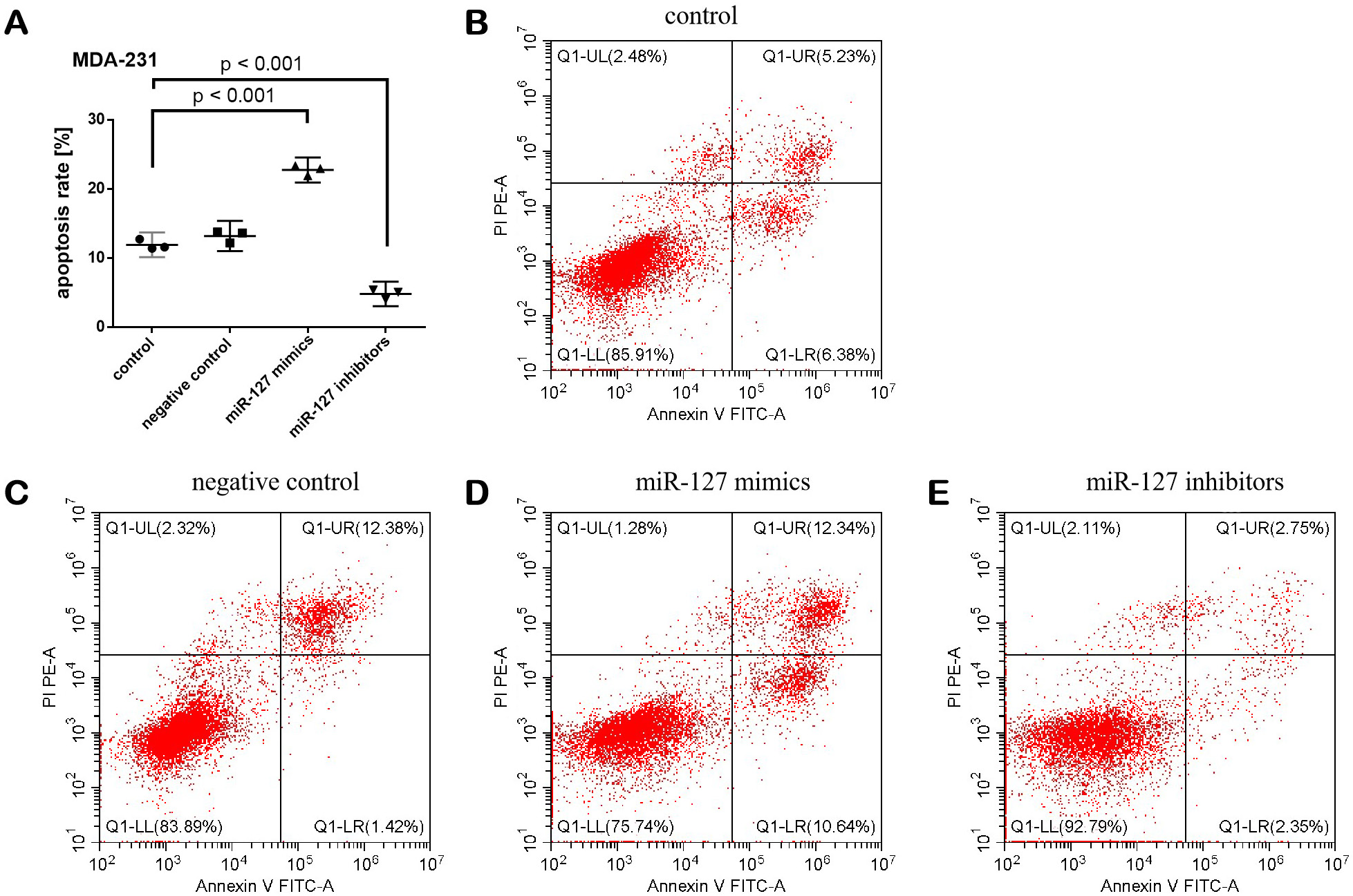 Moreover, the treatments had a statistically significant effect on both the MCF-7 apoptosis rate (F (3,8) = 169.603, p < 0.001) and the MDA-231 apoptosis rate (F (3,8) = 279.029, p < 0.001) (Figure 3, Figure 4). When compared with controls, the apoptosis rate of MCF-7 and MDA-231 cells was significantly increased after the cells were transfected with miR-127 mimics. In contrast, the apoptosis rate of MCF-7 and MDA-231 cells was inhibited after the cells were transfected with inhibitors.