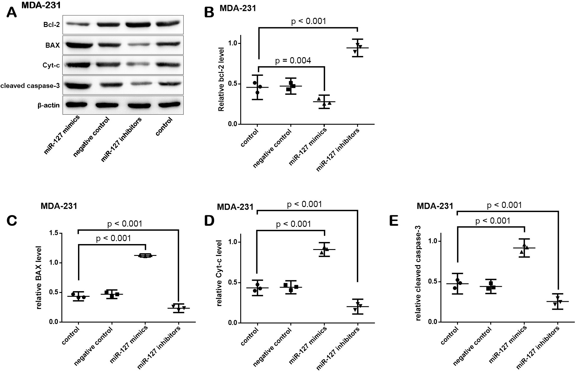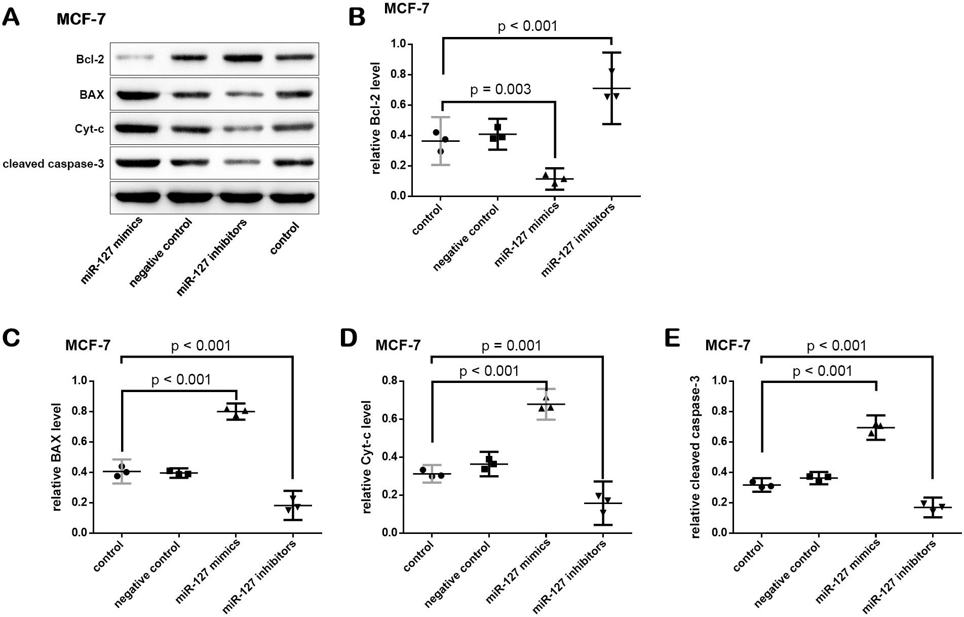When compared with controls, the expression of Bcl-2 was significantly decreased, but the expression levels of BAX, Cyt-c and cleaved caspase-3 were significantly increased after MCF-7 and MDA-231 cells were transfected with miR-127 mimics. Conversely, the expression level of Bcl-2 was increased, but the expression levels of BAX, Cyt-c and cleaved caspase-3 were decreased after the cells were transfected with miR-127 inhibitors.