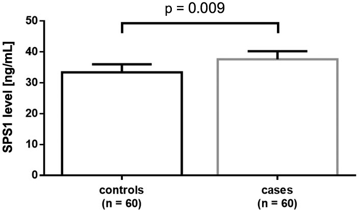 A statistically significant effect of the treatments on both the relative SPP1 level in MCF-7 cells (F (3,8) = 165.636, p < 0.001) and MDA-231 cells (F (3,8) = 73.849, p < 0.001) was found (Figure 8). When compared with controls, the relative SPP1 level in MCF-7 and MDA-231 cells was significantly decreased after transfection with miR-127 mimics. Conversely, the relative SPP1 level in MCF-7 and MDA-231 cells was increased after cells were transfected with miR-127 inhibitors. The SPP1 level was significantly increased in the plasma of BRC patients compared to controls (Student’s t-test, t = 2.292, df = 118, p = 0.009) (Figure 9).