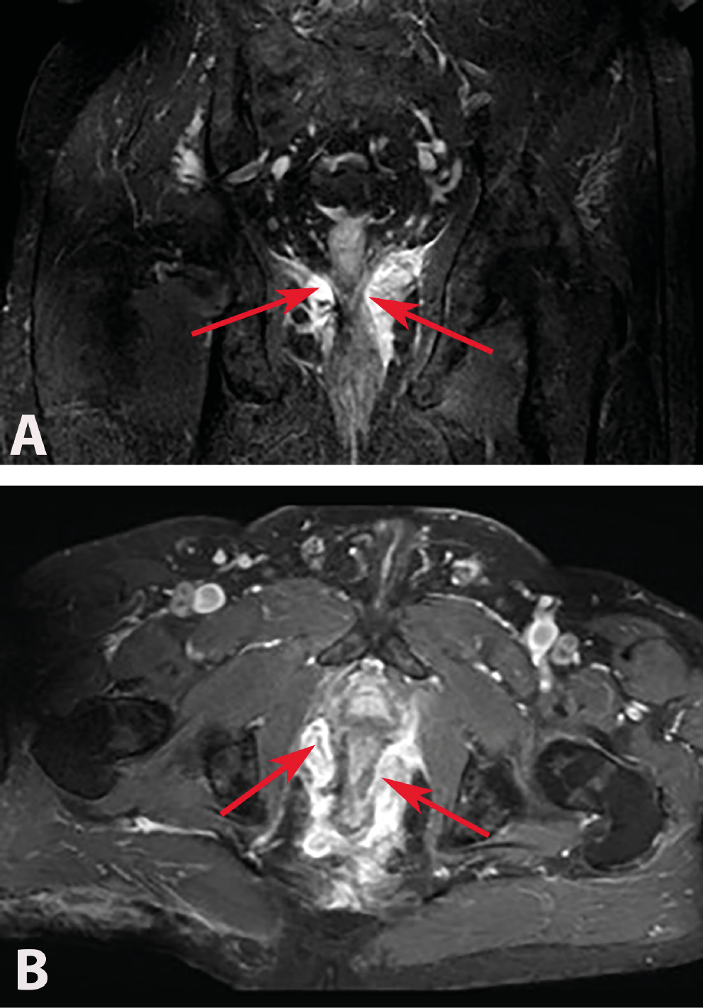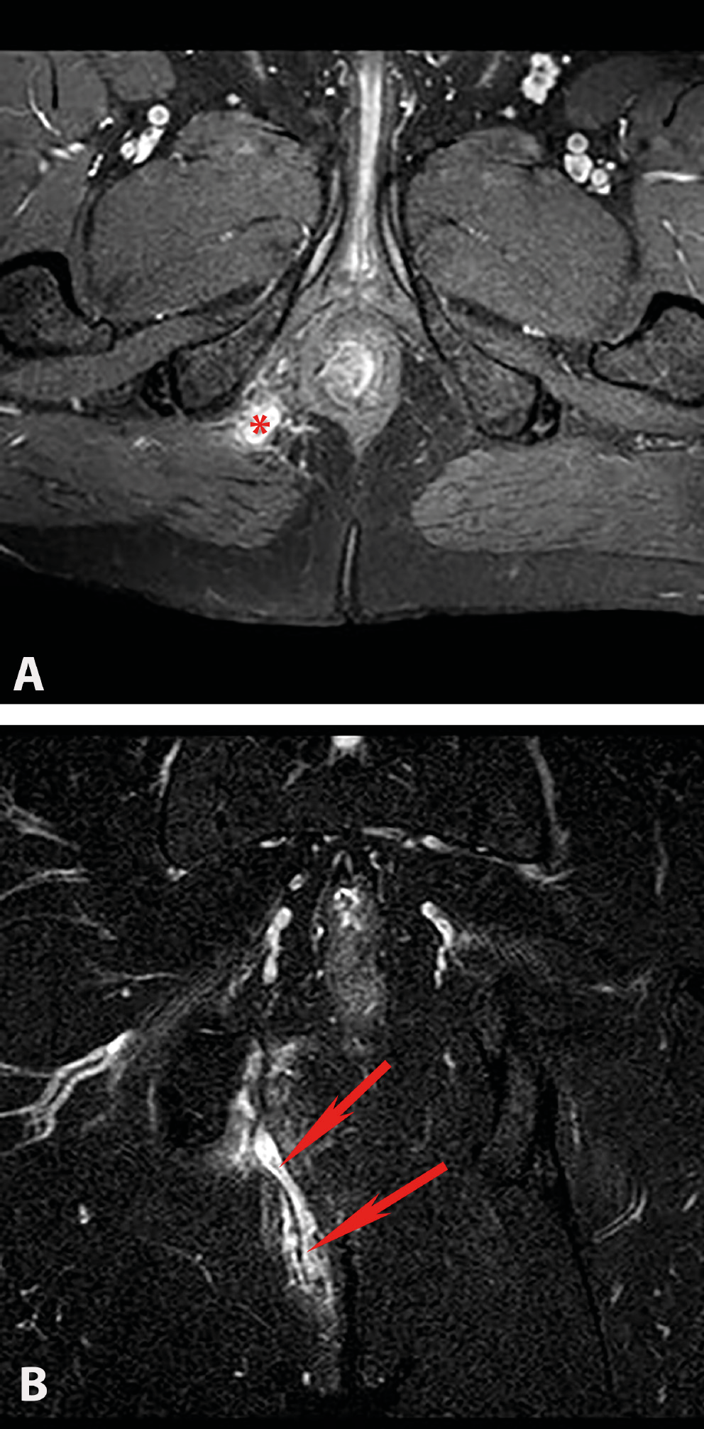 Of the 114 patients included in the study, 78 had complex chronic anal fistulas, and 36 had anorectal abscesses accompanied by anal fistulas. As a result of the MRIs performed in the anorectal abscess group, perianal abscesses were detected in 14 (58%) patients (Figure 2A,B), ischiorectal abscesses in 6 (25%) patients (Figure 3A,B) and intersphincteric abscesses in 4 (17%) patients (Figure 4). Suprasphincteric fistulas were observed in 3 patients, extrasphincteric fistulas were found in 2 patients, horseshoe fistulas were present in 2 patients (Figure 5A,B), and transsphincteric fistulas were observed in the remaining patients with complex fistulas. Thirteen patients had 2 external fistula ora and 4 patients had 3 external fistula ora. Eight patients in the fistula group had an abscess pouch associated with the fistula tract. These findings are consistent with the literature.