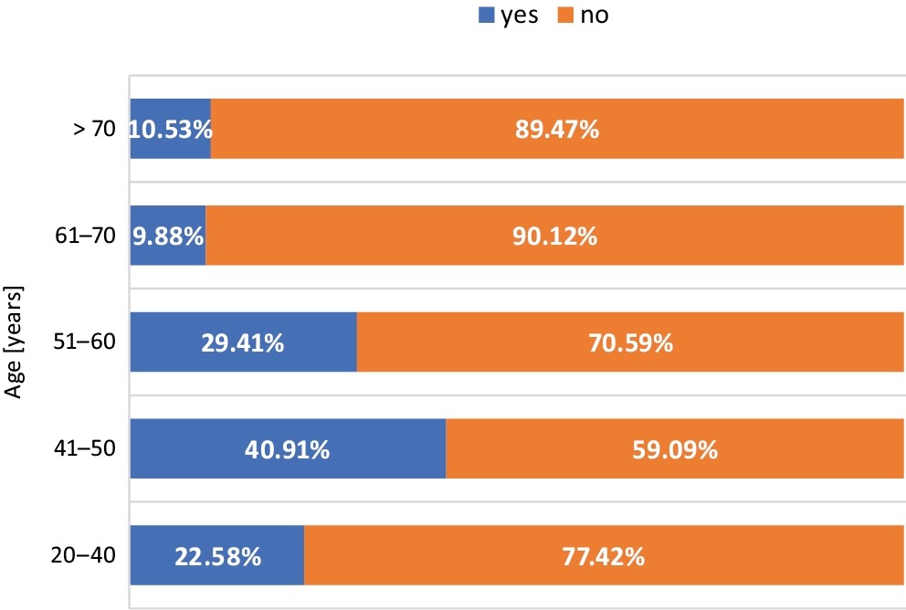 The total study group was comprised of 146 women (64.9%) and 79 (35.1%) men. The largest response group represented people between the ages of 61–70 (36%), the 2nd largest group was over 70 (25.3%), 15.1% were between 51–60, 13.8% between 20–40, and the smallest group was between 41–50 (9.8%). Of all participants, 29.3% had a higher level of education, 63.6% gained secondary education, and 7.1% completed only primary education. Table 1 summarizes the demographic structure of the group.