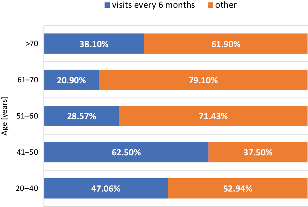 Of the respondents, almost 45% stated that they do not know how often they should have a dental check-up, and around 6% thought that there is no need for further dental appointments after implant treatment. This could be explained by findings in other studies, which reported patients’ problem-oriented check-up behavior and pain as a common reason for visiting the dentist.27, 28 In contradiction to our findings of insignificant differences between genders, some studies29, 30, 31 indicated that women visit the dentist more frequently than men and show greater awareness of oral health.