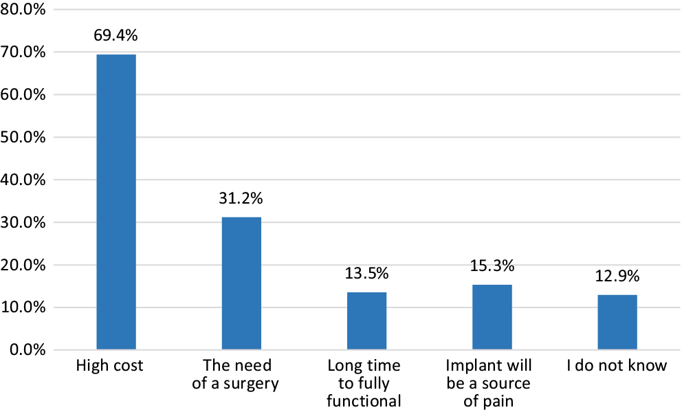 To assess patients’ major concerns regarding implant treatment, we asked a multiple-choice question. The 2 issues stated by the participants were high cost (69.4%) and the need for surgery (31.2%), with 15.3% of respondents replying: “I’m afraid the implant will be a source of pain,” 13.5% stating: “It takes time to complete the treatment and have a fully functional implant,” and 12.9% (22 out of 170) replying: “I do not know” (Figure 4).