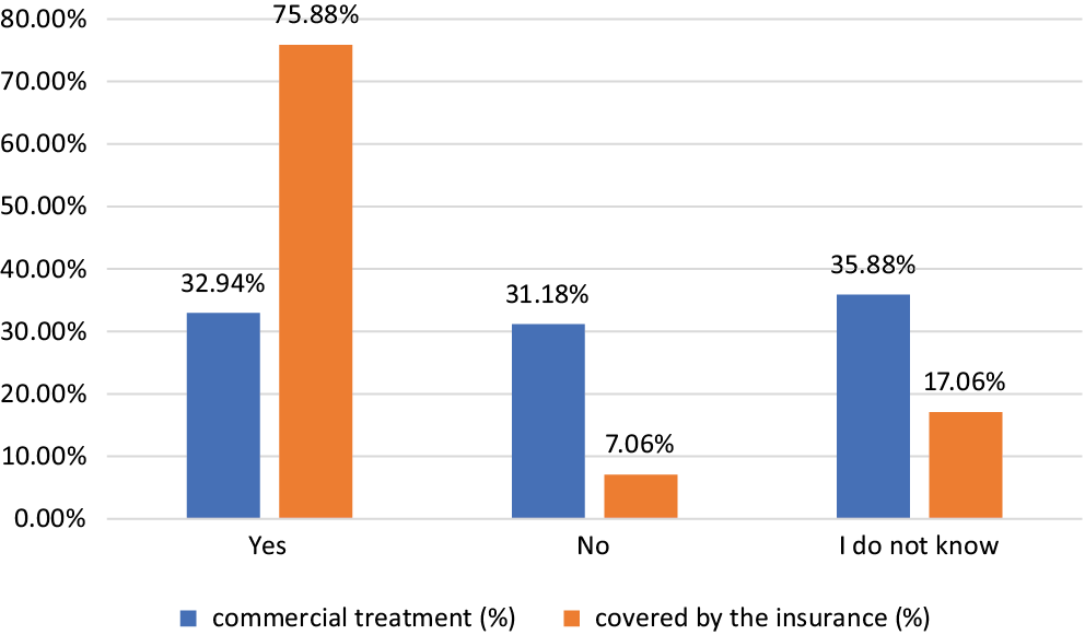 Patient willingness to undertake an implant treatment depending on the source of financing is shown in Figure 5. Regarding commercial treatment, 32.9% would like to have the implant if offered, 31.2% rejected it, and 35.9% did not know. However, when we asked if they would undergo treatment if the procedure was covered by the insurance, 75.9% answered affirmatively, only 7.1% rejected it, and 17% did not know. The χ2 test indicated a strong relationship between the respondent’s willingness and the source of treatment financing (p < 0.005). There were insignificant differences between men and women in commercial (p = 0.703) and insurance-covered treatment (p = 0.447). We did not find a relationship between the education level (secondary and high) and willingness for commercial (p = 0.143) or insurance-covered treatment (p = 0.111).