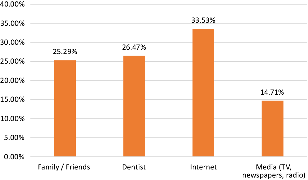 Regarding the question on the source of information about dental implants, 1/3 of the respondents (33.5%) indicated the Internet. The 2nd common source was a dentist (26.5%), followed by family/friends (25.3%), and the media (television, newspapers, and radio) (14.7%) (Figure 6).