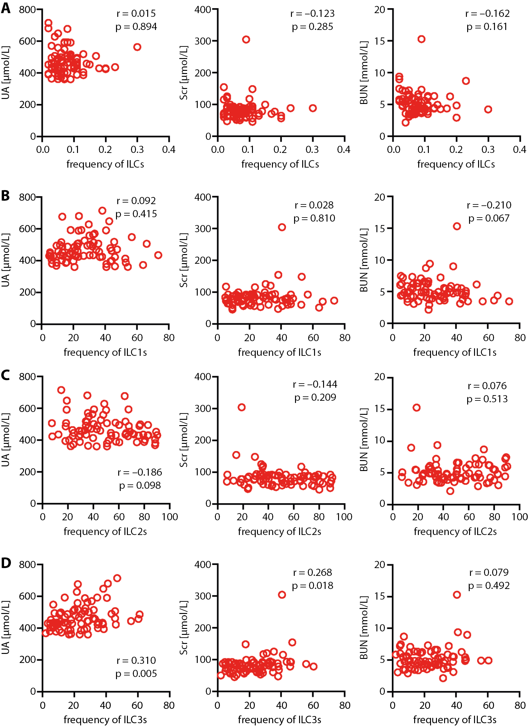Correlations between the levels of circulating ILCs and their subgroups with UA-associated parameters (serum UA, Scr and blood urea nitrogen) in patients with HUA were assessed. As shown in Figure 2A–C, no significant correlations were found between the frequencies of circulating ILCs, ILC1s or ILC2s, and UA-associated parameters. In contrast, the frequency of ILC3s in PBMCs from patients with HUA positively correlated with serum levels of UA (rs = 0.310, p = 0.005) and Scr (rs = 0.268, p = 0.018) (Figure 2D).