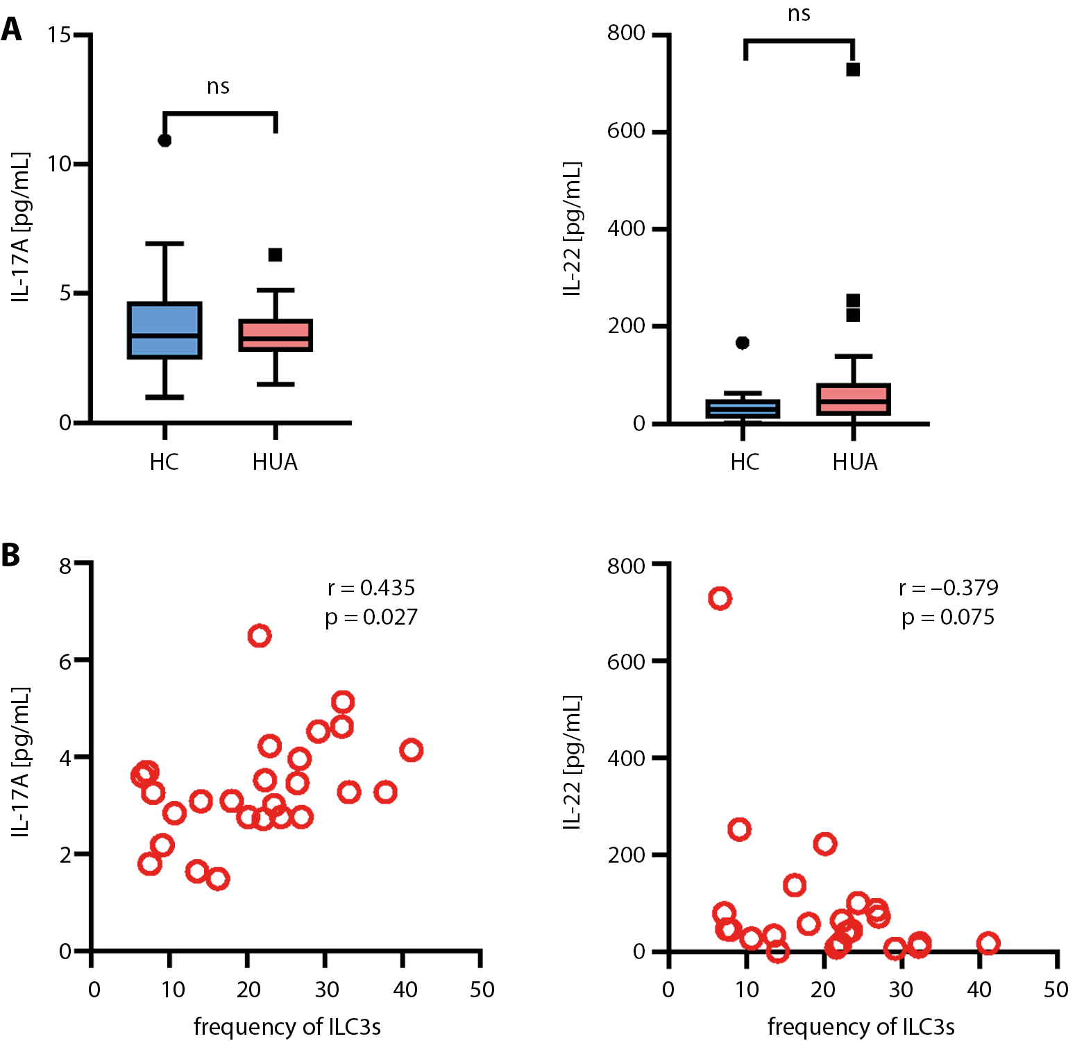 Plasma concentrations of ILC3-related cytokines (IL-17A and IL-22) were compared between the 2 groups, with samples from 26 HUA patients and 24 HC being available for ELISA analysis. Although no differences in plasma IL-17A (3.36 (2.47–4.70) compared to 3.26 (2.75–4.00) pg/mL, U = 289, p = 0.66) or IL-22 (29.25 (12.31–49.13) compared to 45.15 (16.69–86.51) pg/mL, U = 186.5, p = 0.14, Table 2) concentrations were detected between the 2 groups, a positive correlation was observed between plasma IL-17A concentration and the frequency of circulating ILC3s in patients with HUA (Figure 3).