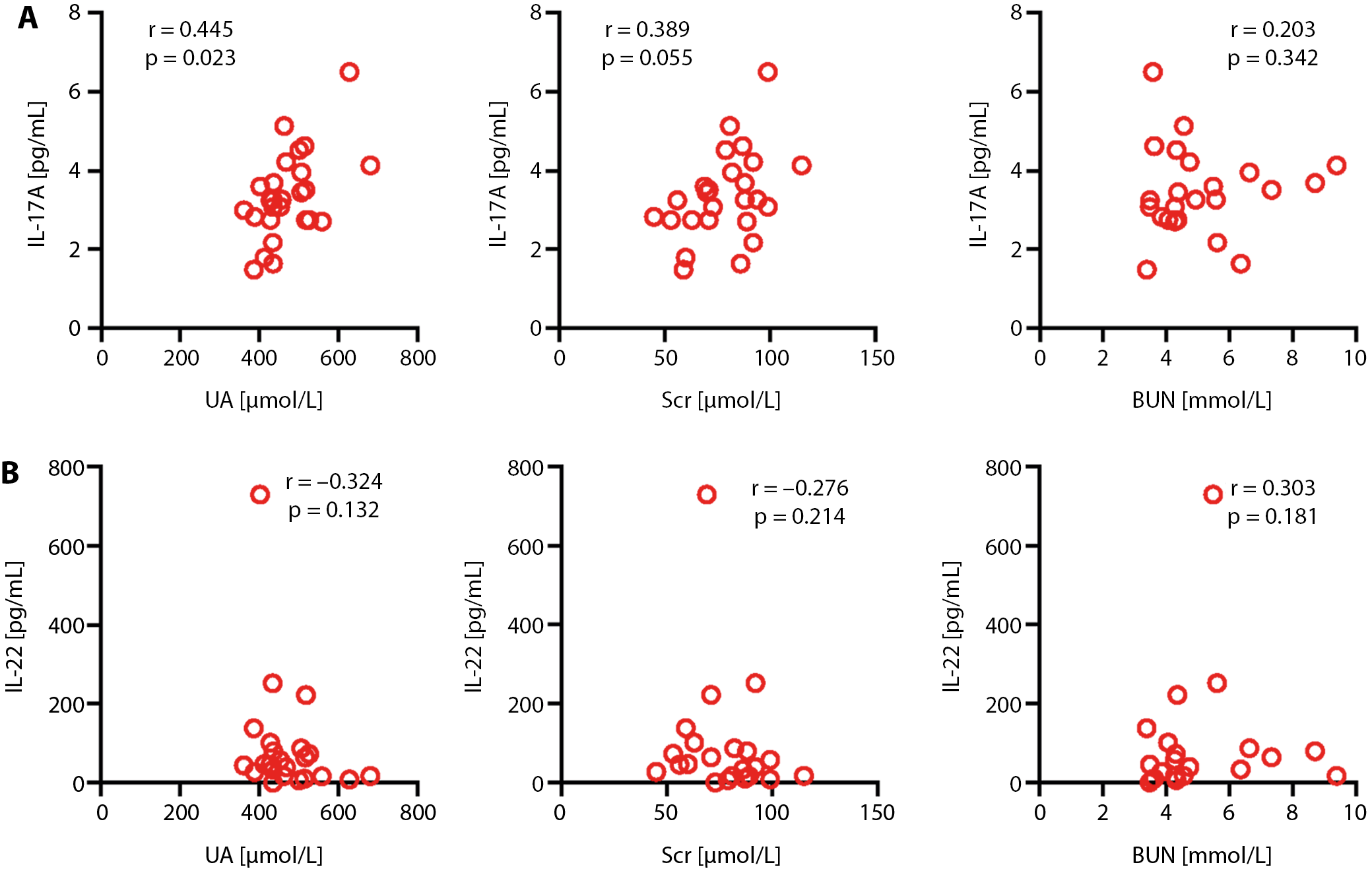 Finally, the associations between ILC3-related cytokines and UA-associated parameters were assessed with the Spearman’s rank-order correlation. Plasma IL-17A positively correlated with serum UA levels (rs = 0.445, p = 0.023); however, no correlations were observed between IL-22 and UA-associated parameters (Figure 4).
