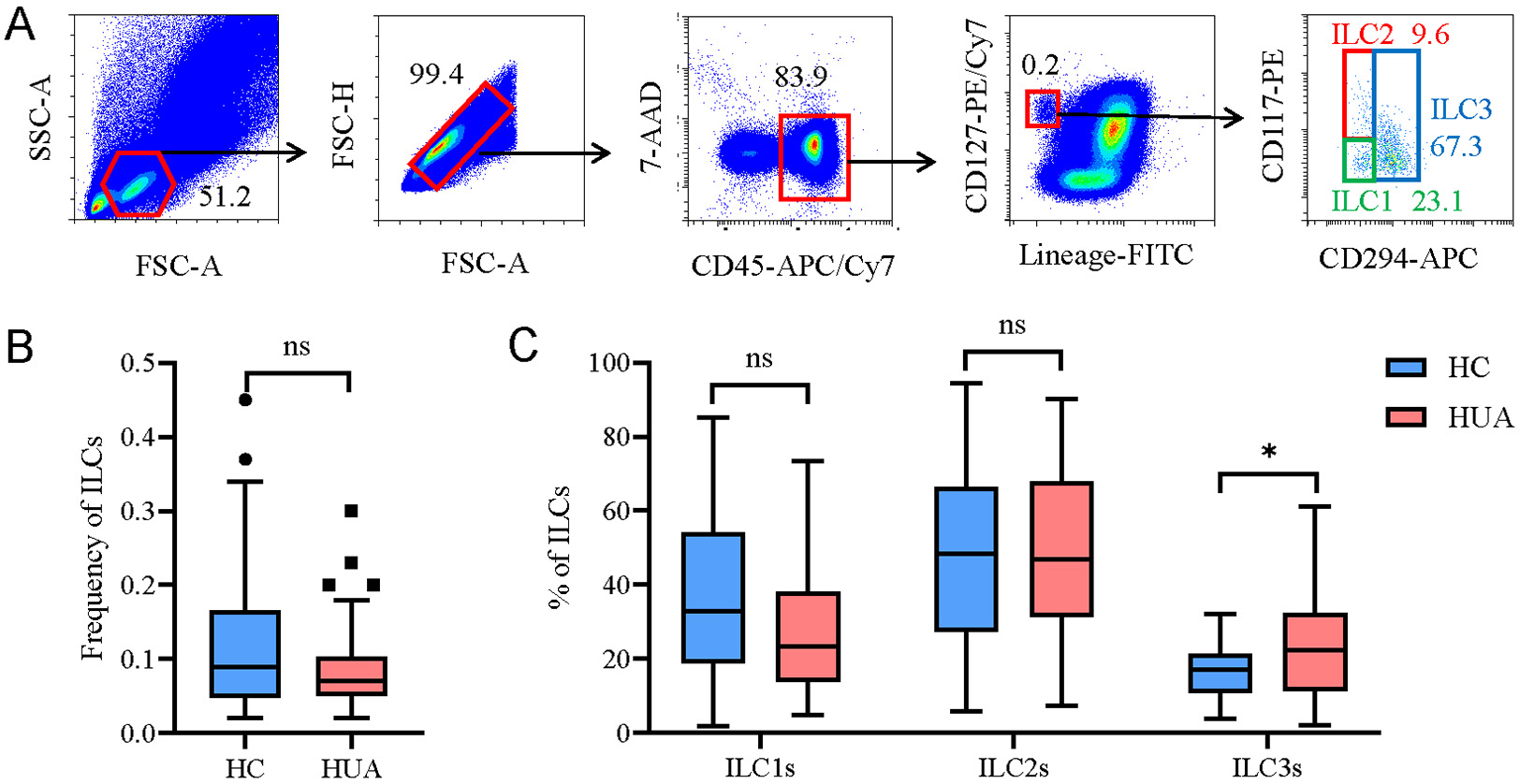 Materials and methods. Type 3 innate lymphoid cells and their subsets were detected using flow cytometry in peripheral blood mononuclear cells (PBMCs) of 80 HUA patients and 30 healthy controls (HC). Plasma levels of IL-17A and IL-22 were measured with enzyme-linked immunosorbent assay (ELISA). Clinical data of enrolled subjects were collected from electronic medical records.