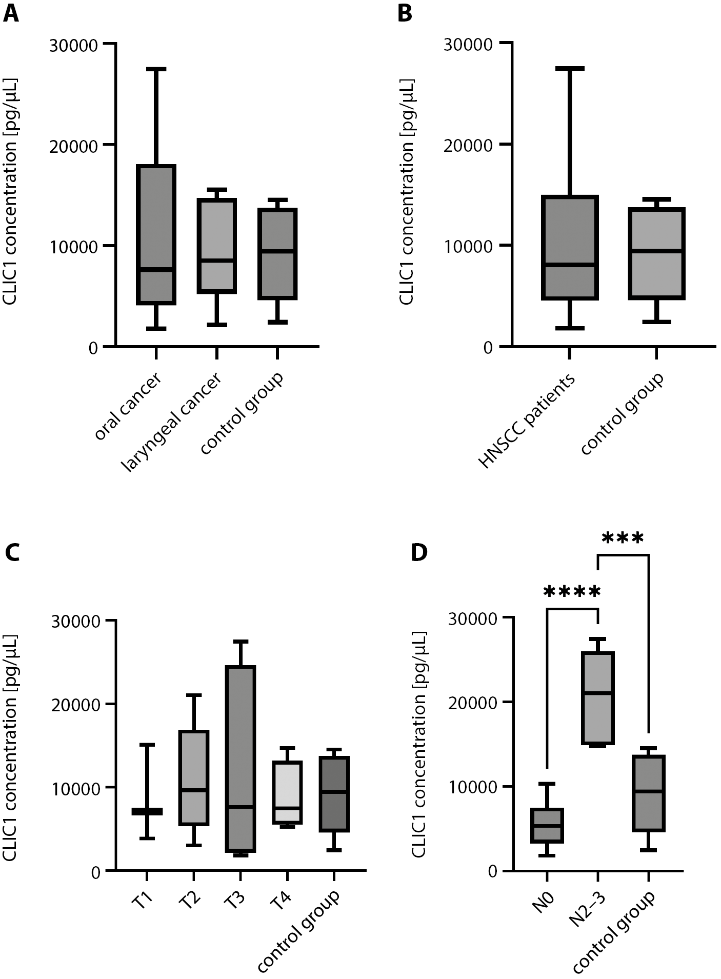 We measured and compared CLIC1 plasma concentrations in 4 groups: LSCC, OSCC, HNSCC (all patients from the LSCC and OSCC groups combined), and healthy controls.