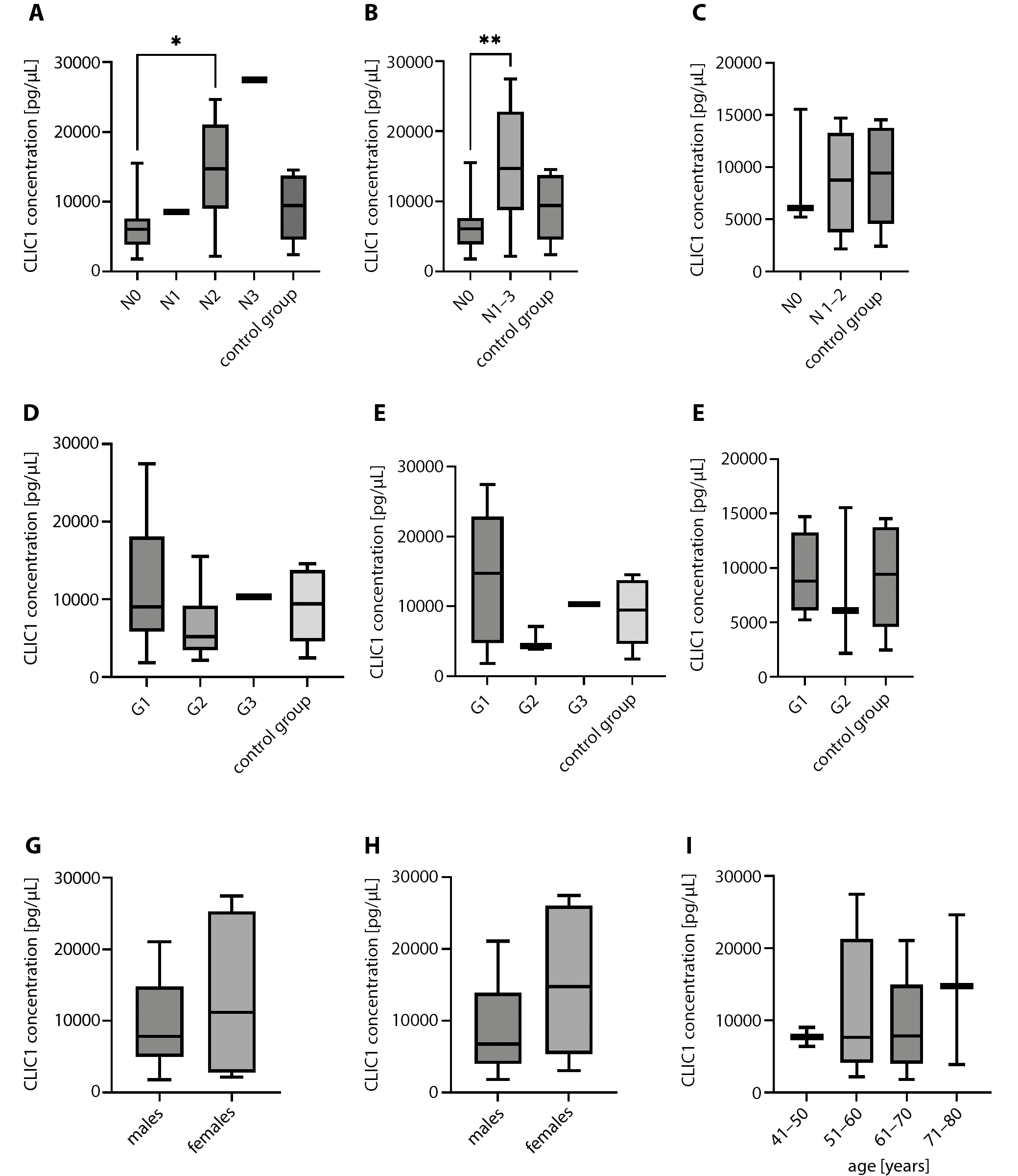 The GraphPad Prism v. 8 software program (GraphPad Software, San Diego, USA) was used to perform the statistical analyses. The value of p < 0.05 was considered statistically significant. The Kolmogorov–Smirnov normality test was performed to check for distribution normality. The Student’s t-test, Kruskal–Wallis test, Dunn’s multiple comparisons test, and Tukey’s multiple comparisons test were used to calculate the differences in CLIC1 plasma levels between the groups. The Spearman’s rank correlation coefficient was used to calculate the correlation between CLIC1 plasma concentration and TNM staging.