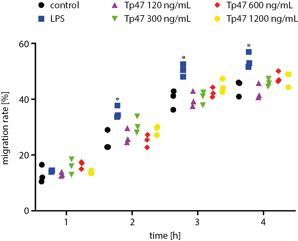 Using the transwell assay, we examined the migration ability of DCs in response to the chemokine CCL21. The results showed that the proportion of DCs that migrated to the lower chamber after 24 h of stimulation by Tp47 (120, 300, 600, and 1200 ng/mL) did not increase significantly compared with that of the control group. However, the proportion of DCs that, after stimulation with 1 μg/mL LPS, migrated to the lower chamber was significantly increased at 2 h, 3 h and 4 h compared to the control group (Figure 3).
