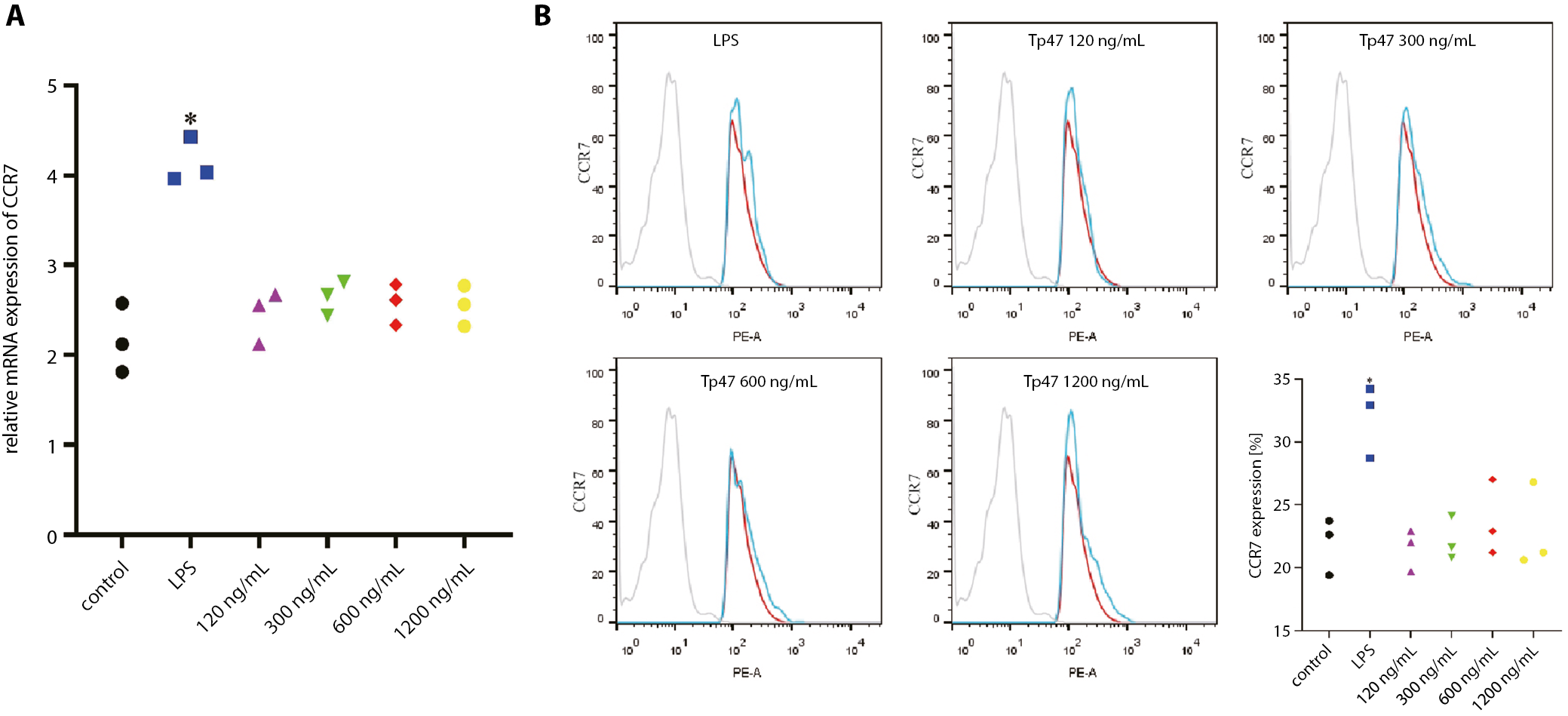 Conclusions. The Tp47 promoted the maturation of DCs while not enhancing CCR7-mediated DC migration ability. This may be one of the mechanisms by which T. pallidum escapes host immune clearance.