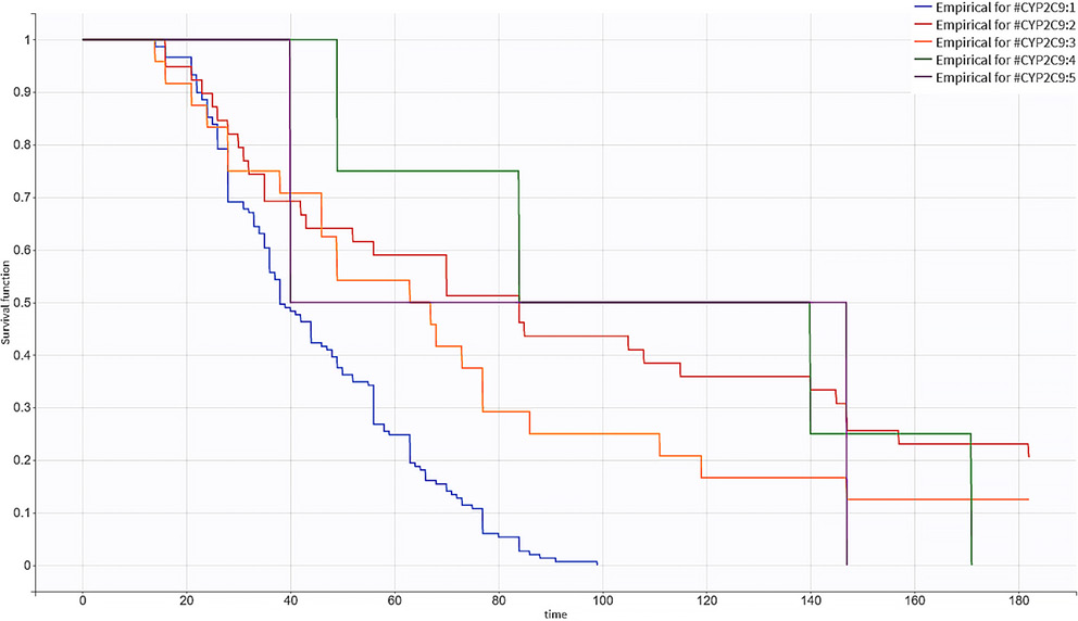 Results. A total of 218 participants were included in the study. The Weibull model was observed to have the lowest OFV (1989.82). The expected time to reach a stable dose in the population was 21.35 days. The CYP2C9 genotypes were identified as the only significant covariate. The HR (95% CI) for achieving a stable warfarin dose within 6 months of initiation for individuals with CYP2C9 *1/*2 was 0.2 (0.09, 0.3), 0.2 (0.1, 0.5) for CYP2C9 *1/*3, 0.14 (0.04, 0.6) for CYP2C9 *2/*2, 0.2 (0.03, 0.9) for CYP2C9 *2/*3, and 0.8 (0.45, 0.9) for those with the C/T genotype for CYP4F2.