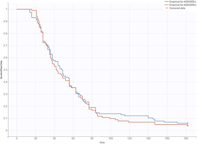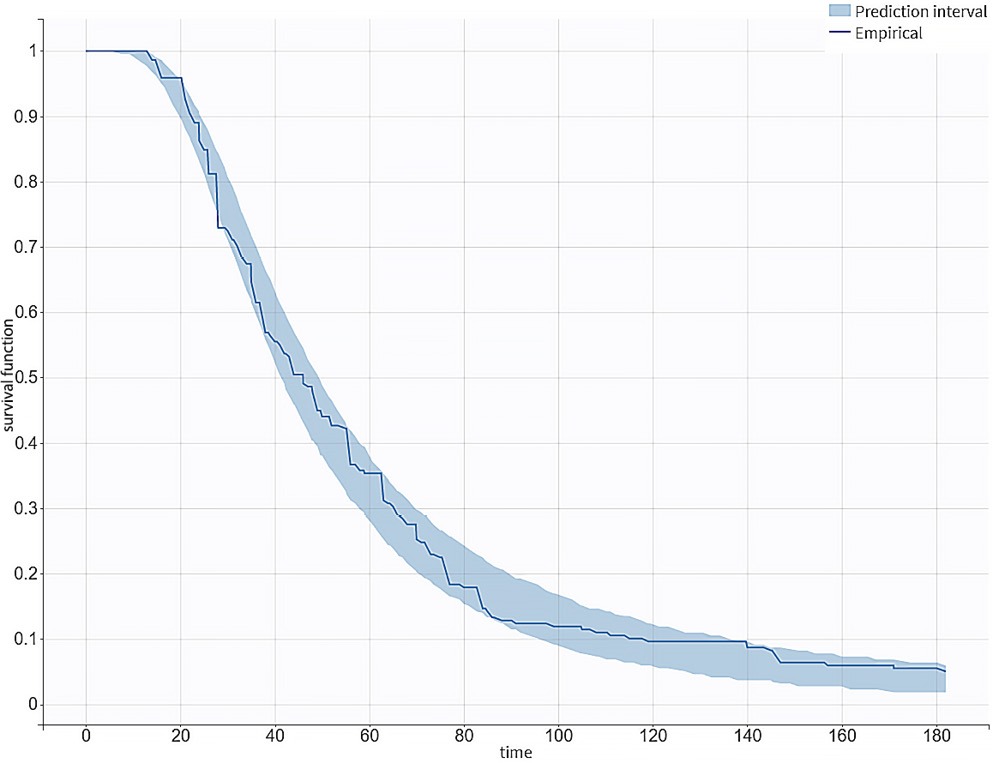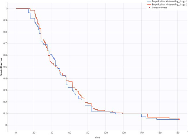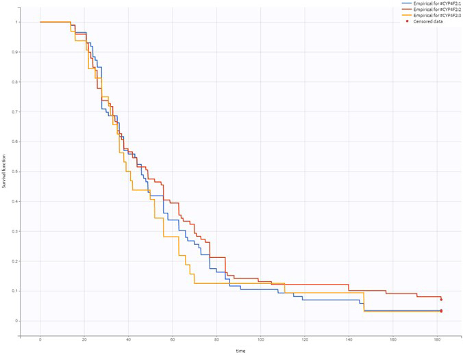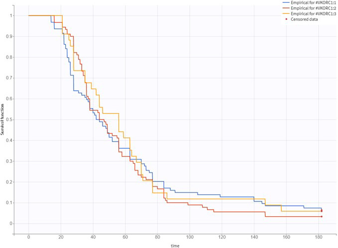 Time to achieve a stable warfarin dose was the outcome variable with the following covariates: age, gender, CHA2DS2-VASc score, HASBLED score, SAMe-TT2R2 score, presence of any drugs with potential interaction, PT-INR categories (either between 2.5 and 3.5 or between 2 and 3), and genotypes of CYP2C9, VKORC1 and CYP4F2. We explored the following base models: exponential, Gompertz, log-logistics, and Weibull. The model with the lowest (minimum) objective function value (OFV) was chosen. Both the Wald test and a decline in OFV by at least 3.84 points were used as criteria for defining significant covariates.7 The HRs were calculated for the significant covariates using standard formulae.8 A visual predictive check (VPC) was used for evaluating the model fit.