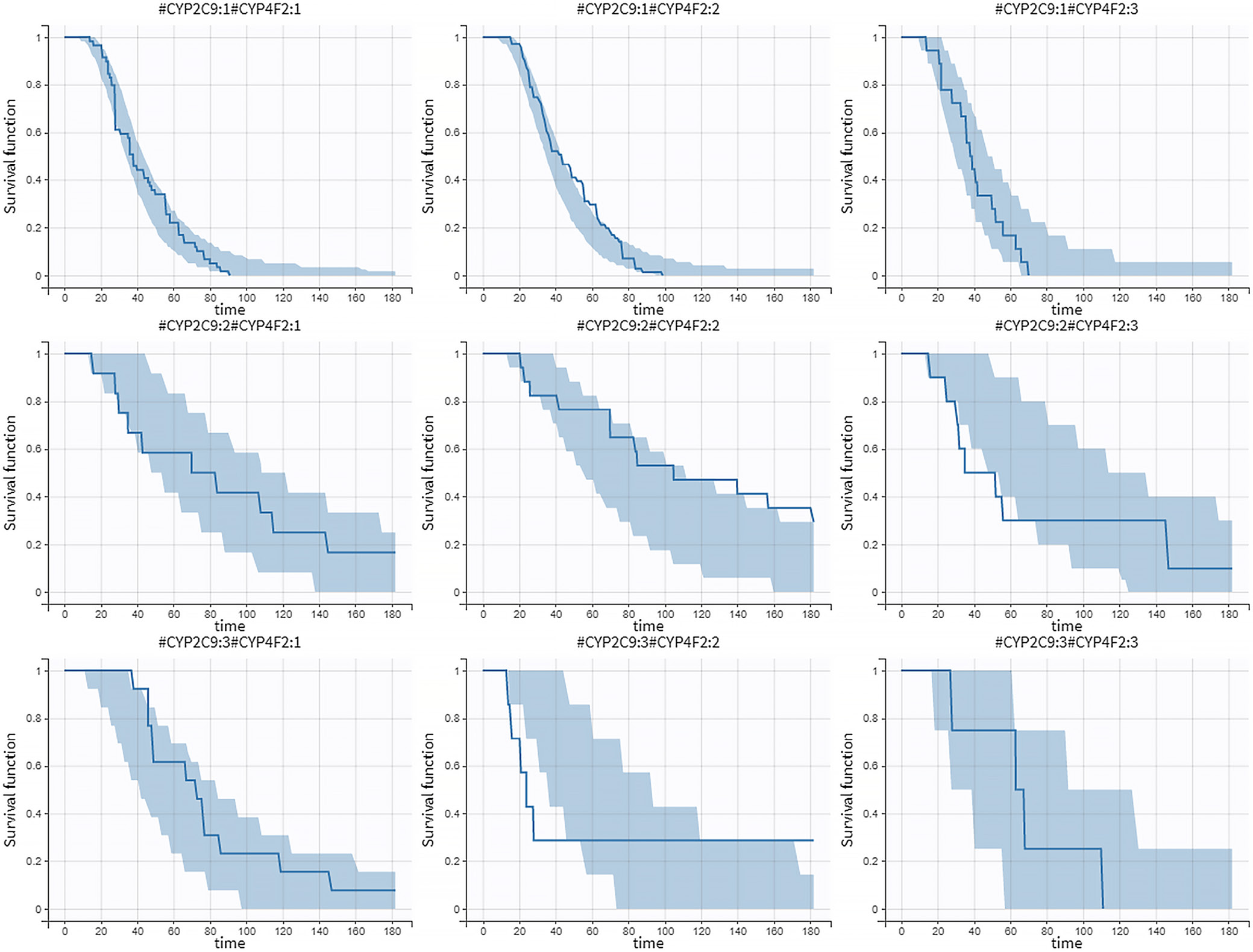 The VPC revealed a good fit of the model to the observed data (Figure 6). Those with CYP2C9 *1/*1 and CYP4F2 C/C genotypes were observed to have a shorter time to achieve a stable warfarin dose compared to other genotype categories (Figure 7).