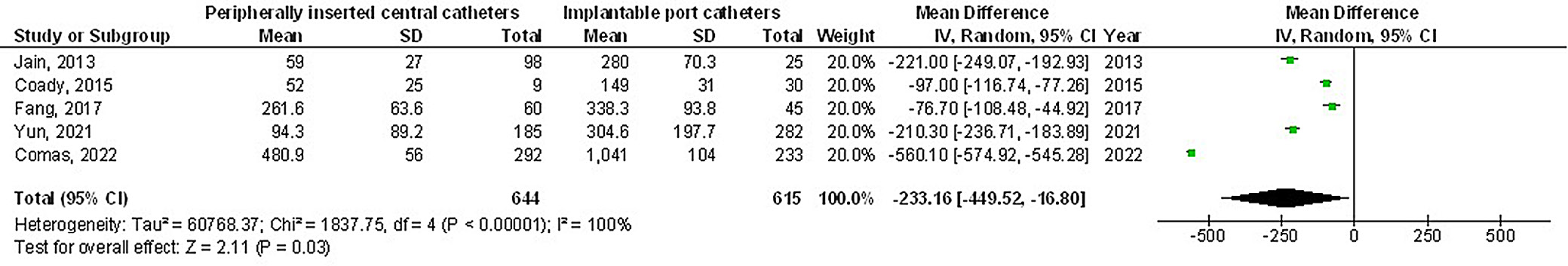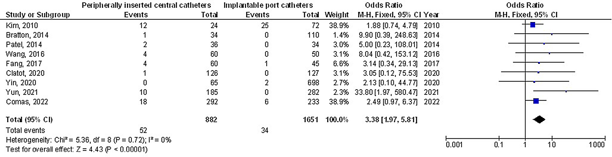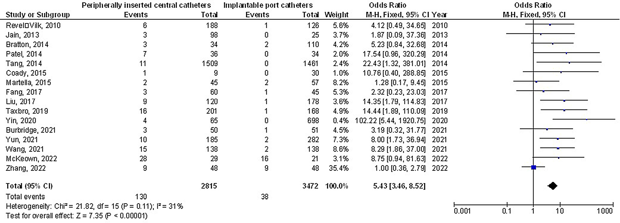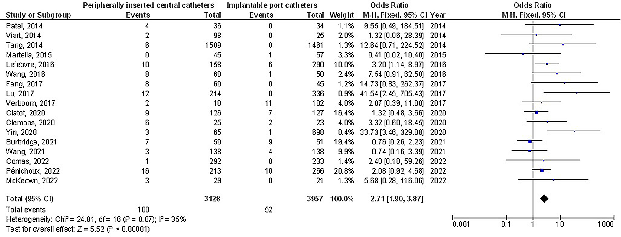 Results. Peripherally inserted central catheters had significantly higher incidence of occlusion complications (OR: 5.43, 95% CI: 3.46–8.52, p < 0.001), longer durations of local infection (OR: 2.94, 95% CI: 2.17–4.00, p < 0.001), higher incidence of catheter-related infection (OR: 2.13, 95% CI: 1.19–3.83, p = 0.01), higher rate of malposition (OR: 6.46, 95% CI: 2.93–14.27, p < 0.001), higher rates of catheter-related thrombosis (OR: 2.71, 95% CI: 1.90–3.87, p < 0.001), higher incidence of phlebitis complications (OR: 6.67, 95% CI: 2.94–15.11, p < 0.001), higher incidence of accidental removal (OR: 3.38, 95% CI: 1.97–5.81, p < 0.001), and a shorter catheter lifespan (MD: −233.16, 95% CI: −449.52–−16.80, p = 0.03) in subjects undergoing chemotherapy compared to those in whom implanted port catheters were used.
