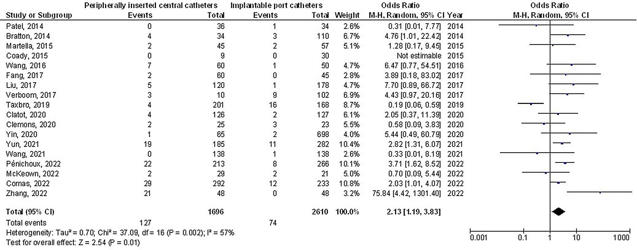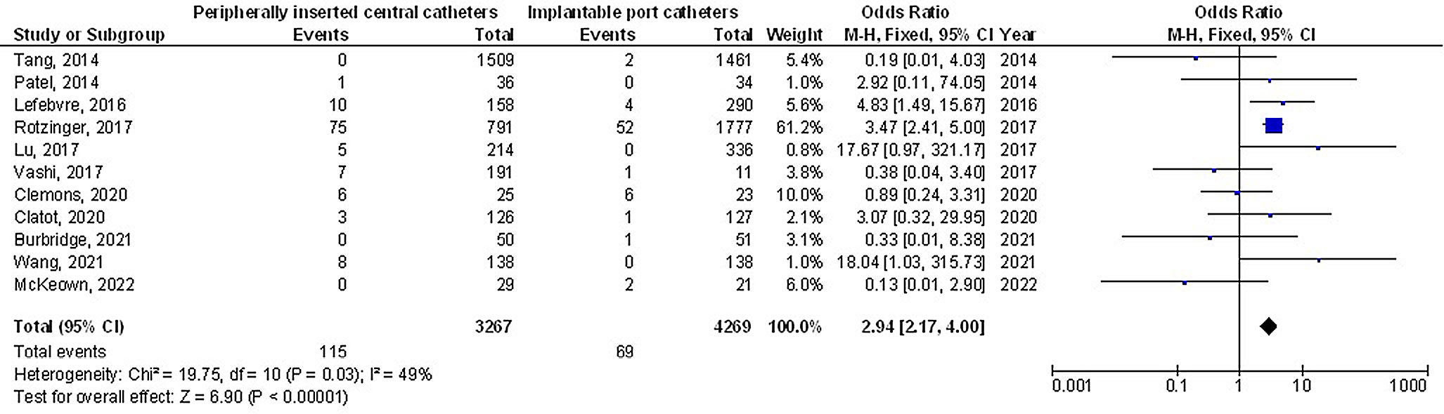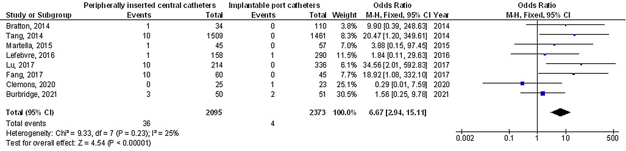 Sensitivity studies were performed on studies that reported and examined the influence of peripherally inserted central catheters compared to implanted port catheters. The comparisons between peripherally inserted central catheters and implanted port catheters were used for sensitivity and subclass analyses.