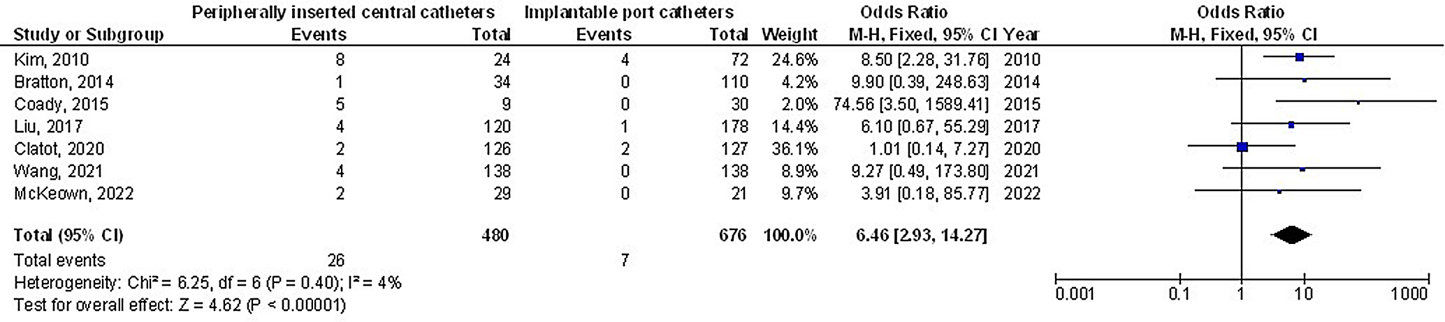 Peripherally inserted central catheters had significantly higher incidence of occlusion complications, longer durations of local infections at puncture sites, higher incidence of catheter-related infection, higher malposition complications, higher rates of catheter-related thrombosis, higher incidence of phlebitis complications, higher accidental removals, and shorter catheter lifespans compared to implanted port catheters. The small sample size of 6 studies in the meta-analysis and the small number of studies evaluating many of the comparisons require care when analyzing the results.