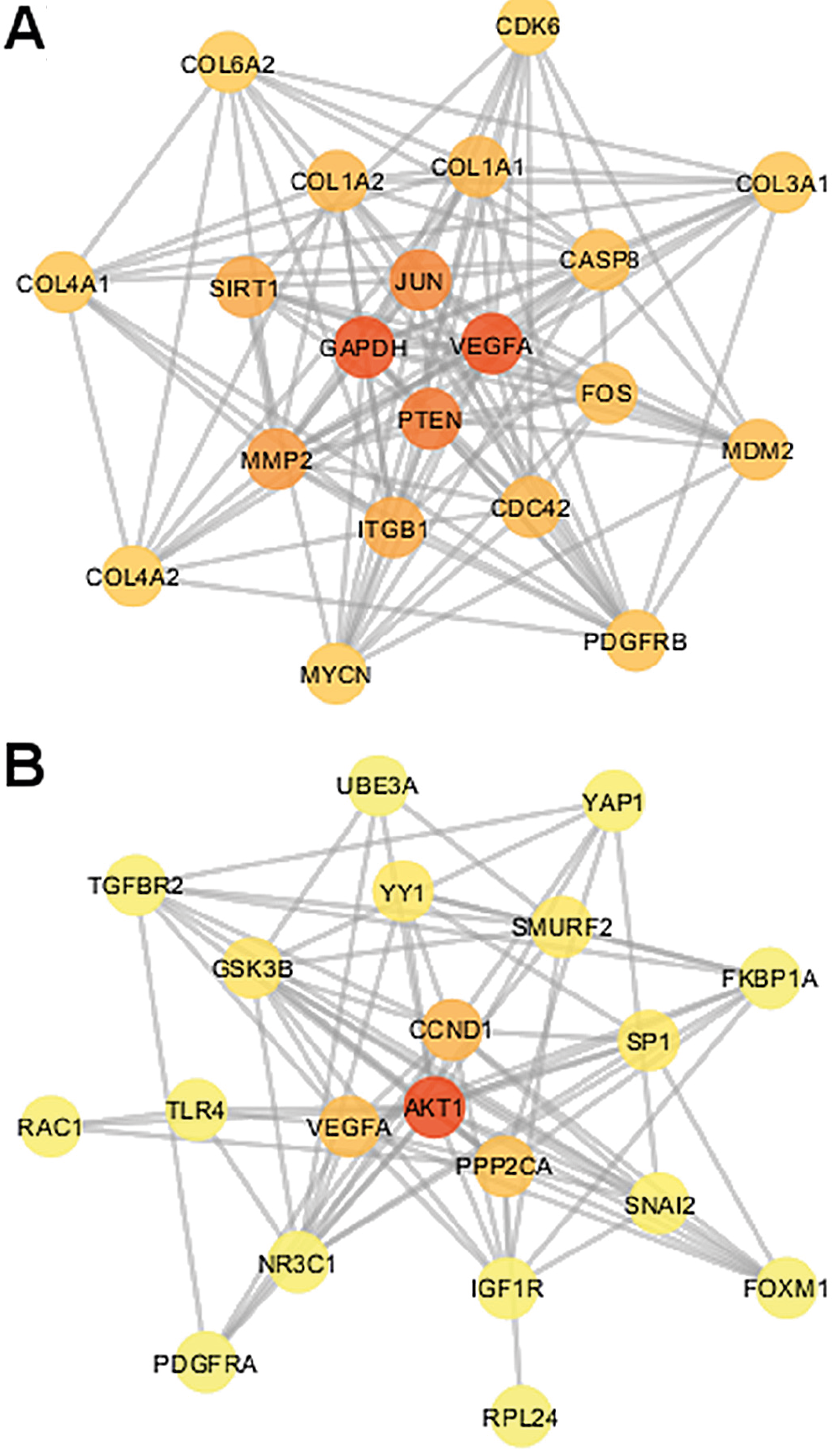 Potential target genes for the 3 miRNAs were identified using miRNet. A total of 254 potential target genes were found for upregulated hsa-miR-29c-3p, while 76 and 234 were found for downregulated hsa-miR-630 and hsa-miR-374b-5p, respectively (3 genes, APOL6, LRIG3 and ATXN1, were shared between the up- and downregulated miRNAs). The genes obtained from miRNet were then used to construct protein–protein interaction networks and identify their hub genes based on the degree of connectivity. The 10 hub genes linked to the upregulated hsa-miR-29c-3p were: VEGFA, GAPDH, PTEN, JUN, MMP2, SIRT1, ITGB1, CDC42, COL1A2, and COL1A1. The 10 hub genes linked to the downregulated miRNAs were: AKT1, CCND1, VEGFA, PPP2CA, GSK3B, SP1, SMURF2, YY1, SNAI2, and YAP1 (Figure 2). Subsequent KEGG pathway enrichment analysis revealed that the targets of the upregulated hsa-miR-29c-3p were enriched in many pathways, including those associated with focal adhesion (p < 0.001) and leukocyte transendothelial migration (p = 0.009). On the other hand, the targets of the downregulated miRNAs were enriched in pathways associated with transforming growth factor beta (TGF-β) signaling (p = 0.004) and various cancers (p < 0.05).