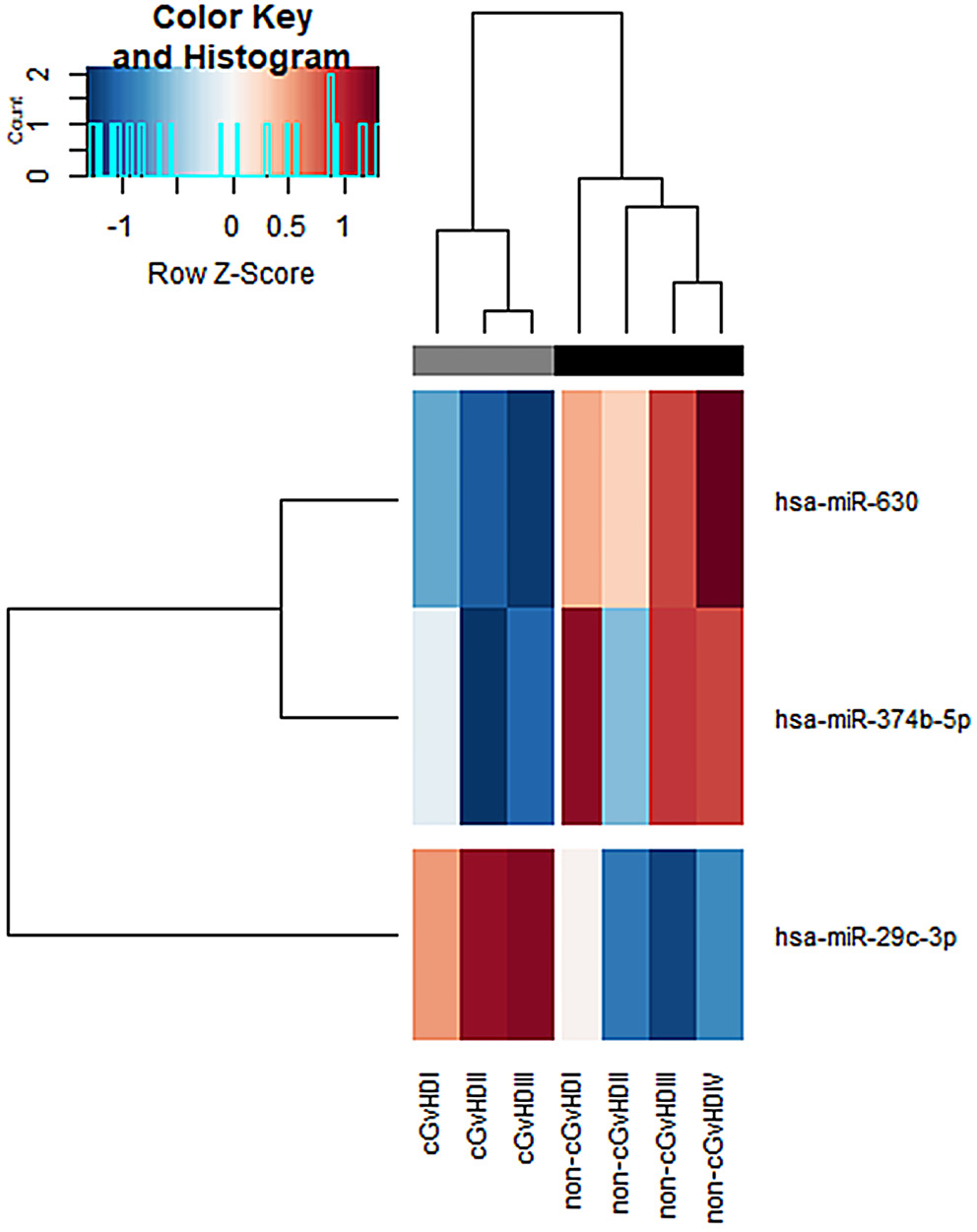 Results. The 2 groups were naturally clustered according to their miRNA profiles using unsupervised hierarchical clustering analysis. We identified 3 miRNAs that were differentially expressed in the cGvHD patients compared to the non-cGvHD patients. The levels of hsa-miR-630 and hsa-miR-374b-5p were lower in the cGvHD patients: 4.1-fold (p = 0.002) and 2.7-fold (p = 0.044), respectively. In contrast, the levels of hsa-miR-29c-3p were 5.8-fold higher (p = 0.004).