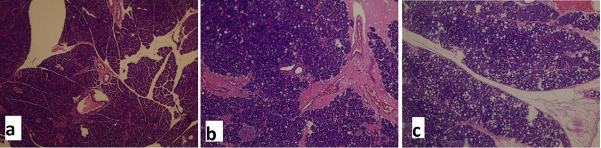 Laparotomy was performed by midline incision following decapitation, and pancreatic tissue was excised for histopathological assessment. Specimens were placed in 10% formaldehyde and delivered to the pathology laboratory. Tissue sections were stained using hematoxylin and eosin (H&E) and then investigated (Figure 1, Figure 2). Edema, inflammation, localization, and necrosis were scored between 0 and 4 using the Schonberg index.11