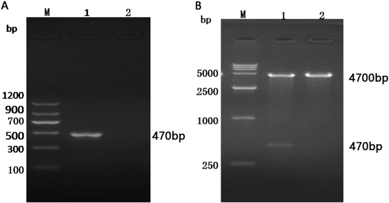 Based on the designed target gene primers, the HBx gene fragment was approx. 470 bp long and this finding was consistent with the prediction (Figure 1A). The recombinant plasmid pEGFP-HBx was treated with rapid restriction endonucleases BglI and KpnI. The products were subjected to 1% agarose gel electrophoresis, and the empty plasmid (pEGFP-C1) was used as a control. The DNA bands of 4700 bp were observed for both, while a DNA band of 470 bp was only observed for the recombinant vector (Figure 1B). Sequencing results of the recombinant plasmid confirmed that HBx was inserted between the BglII and KpnI digestion sites of the pEGFP-C1 empty vector. Blast homology comparison using the National Center for Biotechnology Information (NCBI) database showed that the HBx gene was forwardly connected to the pEGFP-C1 eukaryotic vector, and was named pEGFP-HBx for this study.