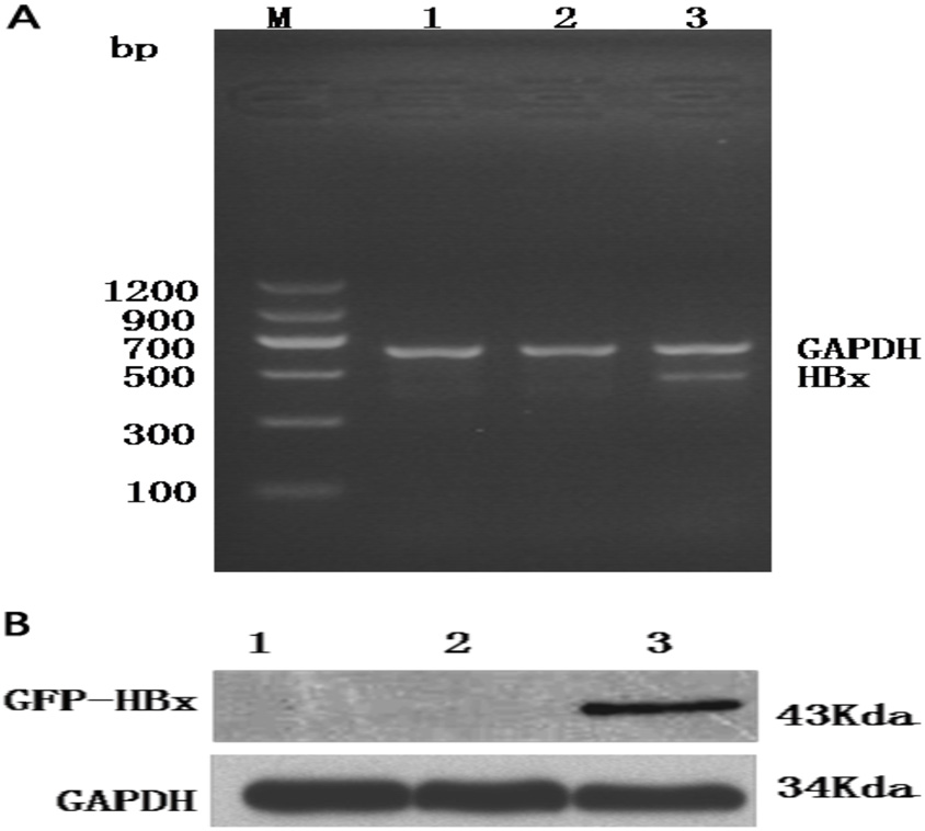 The M-PER™ Mammalian Protein Extraction Reagent (Pierce, Rockford, USA) was used to extract the total protein from the transfected cells, and protein concentration was determined using BCA Protein Assay Reagent A (Pierce) according to the manufacturer’s instruction. Proteins were separated with 10% sodium dodecyl-sulfate polyacrylamide gel electrophoresis (SDS-PAGE), transferred to nitrocellulose membranes, and then detected using the appropriate antibodies, with 12 h incubation time for primary antibody and 2 h for secondary antibody. Rabbit anti-GAPDH was purchased from Xianzhi Company (Guangzhou, China), anti-HBx was purchased from Santa Cruz Biotechnology (Dallas, USA) and anti-p16 was purchased from Cell Signaling Technology (Danvers, USA).