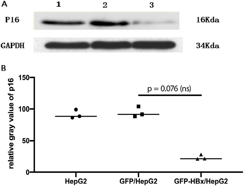 After the Kruskal–Wallis test, no significant difference of p16 relative gray value was found among HepG2, GFP/HepG2 and GFP-HBx/HepG2 groups (as indicated in Supplementary Table 1,2). However, the level of p16 protein in GFP-HBx/HepG2 cells was significantly lower than in GFP/HepG2 cells and HepG2 cells (p = 0.049, p = 0.049) in separate Mann–Whitney U tests, while there was no significant difference in the p16 protein level between GFP/HepG2 and HepG2 cells (Figure 5A,B). Since the authors believe that the differences in p16 protein levels were worthy of interpretation, both the Kruskal–Wallis test and the Mann–Whitney U test results were reported.