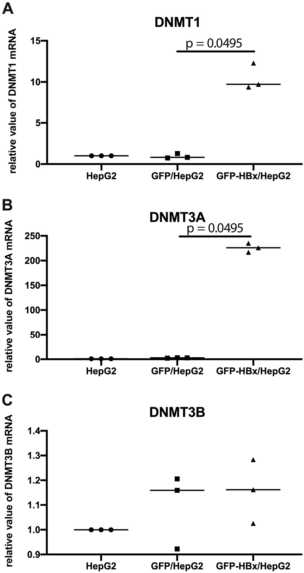 The expression level of DNMT mRNA in HepG2 cells was set at 1.00. The expressions of DNMT1 and DNMT3A mRNA in GFP-HBx/HepG2 cells were significantly higher than in the GFP/HepG2 cells (p = 0.0495), while there was no difference in DNMT3B mRNA (p > 0.05) (Figure 7). Detailed statistics and p-values were reported in Supplementary Table 3.