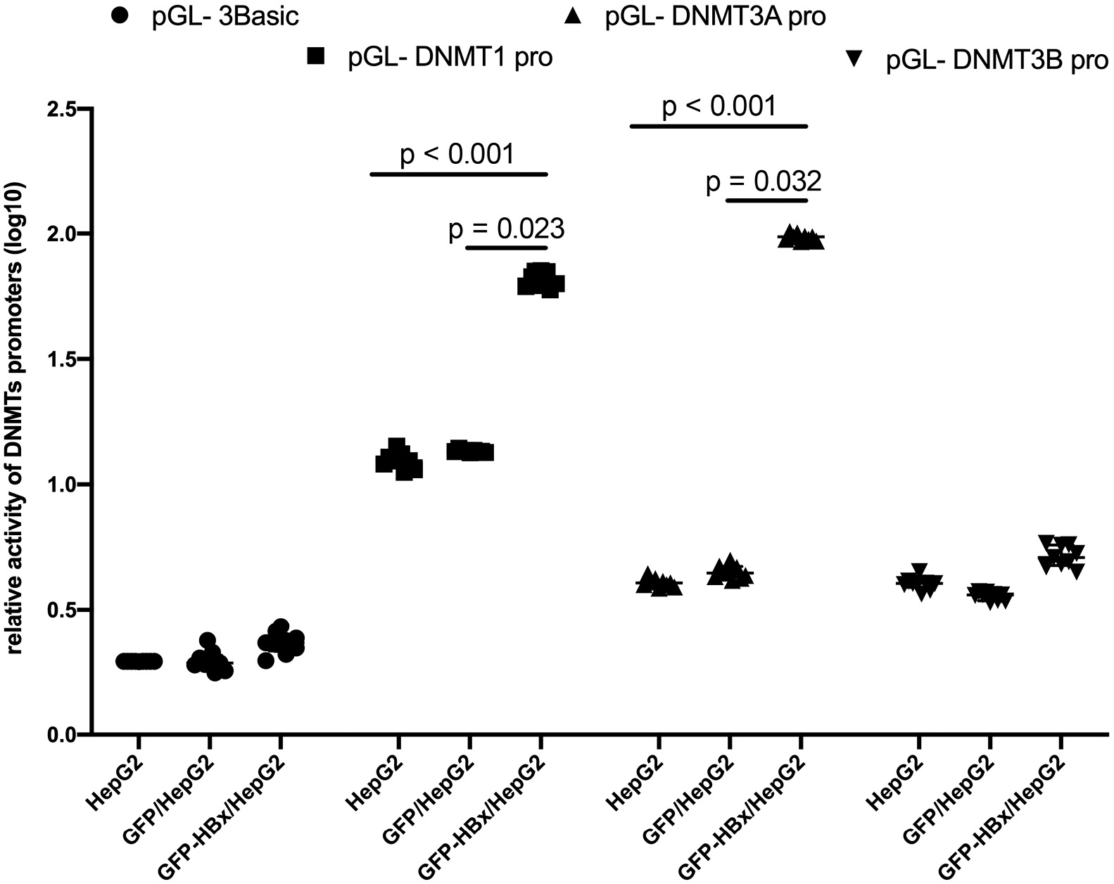 Results. The level of p16 protein in GFP-HBx/HepG2 cells was significantly lower than in HepG2 and GFP/HepG2 cells. The CpG methylation was present in the p16 gene promoter region of GFP-HBx/HepG2 cells. The DNMT1 and DNMT3A mRNA levels in GFP-HBx/HepG2 cells were significantly elevated compared to that in the HepG2 cells (p = 0.0495). The luciferase activity in GFP-HBx/HepG2 cells transfected with the pGL3-DNMT1/3A pro plasmid was significantly higher than in HepG2 and GFP/HepG2 cells (both p < 0.05).